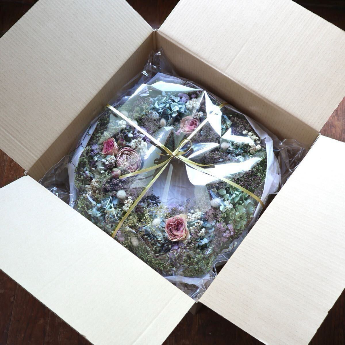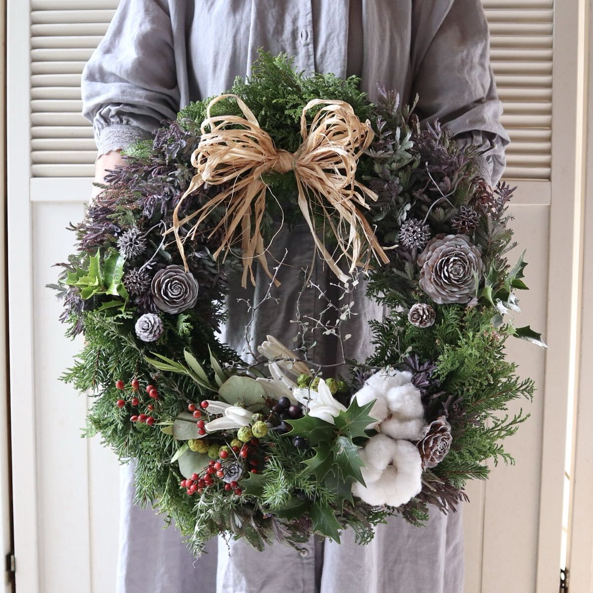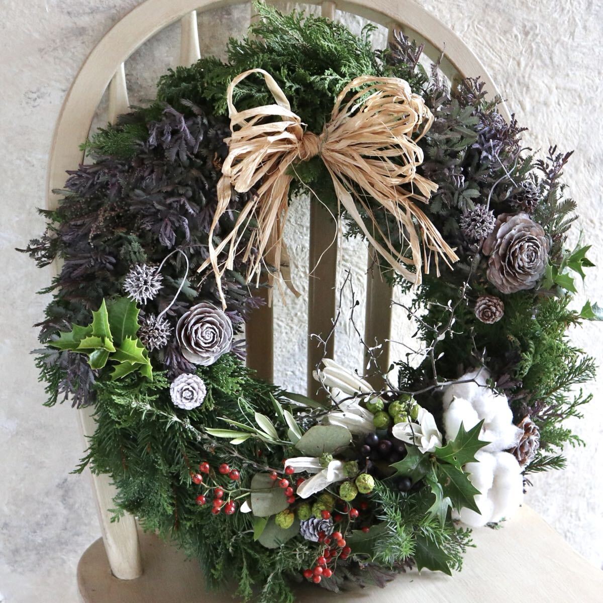 ※こちらのリースは75cmの特大スワッグ以外の作品と合計3点まで同梱可能です。同梱時は2点で送料+200円、3点で送料+400円になります。 ※ 11月15日以降の発送になります。 紫色の新芽が美しいミモザ(銀葉アカシアプルプレア)とヒバをベースに、ふわふわのコットンや実物をあしらいシックで大人っぽい雰囲気のフレッシュリースを作りました。ずっしりと重みがあります。 大きなラフィアのリボンがアクセントになっております。 フレッシュリースならではのヒバの香りをお楽しみいただけます。 全体的に生の状態ですが、徐々にドライになっていきます。クリスマスが終わったあとも、ドライのリースとしてお楽しみいただけます。 ラフィアのリボンはミモザの色に合わせたアンンティークパープルとナチュラルからお選びいただけます。 画像のリースはサンプルになります。 ご注文いただいた後に同じ雰囲気のリースをご希望のお届け日に合わせてお作りいたします。 植物ですので個体差があり完全に同じ風合いにはなりません。 毎日霧吹きで水を与えてあげれば直射日光が当たらない環境でしたら生の質感は1ヶ月半ほど維持できます。 そのまま水を与えずドライにした場合も質感は変わっていきますが色は3ヶ月くらいでしたらほとんど変わりません。 画像9枚目のリースは3ヶ月水を与えず飾ったものです。 特大サイズですのでお店のディスプレイにもおすすめです。 画像10枚目は梱包例です。 無料でリボン、メッセージカードもお付けできます。 使用花材 ミモザ(銀葉アカシアプルプレア)、ヒバ、コットンフラワー、ペイントしたシダーローズ、ラフィアのリボン等 直径45cm ※商品の性質上、輸送中のわずかな実や葉落ちはご容赦ください。 |