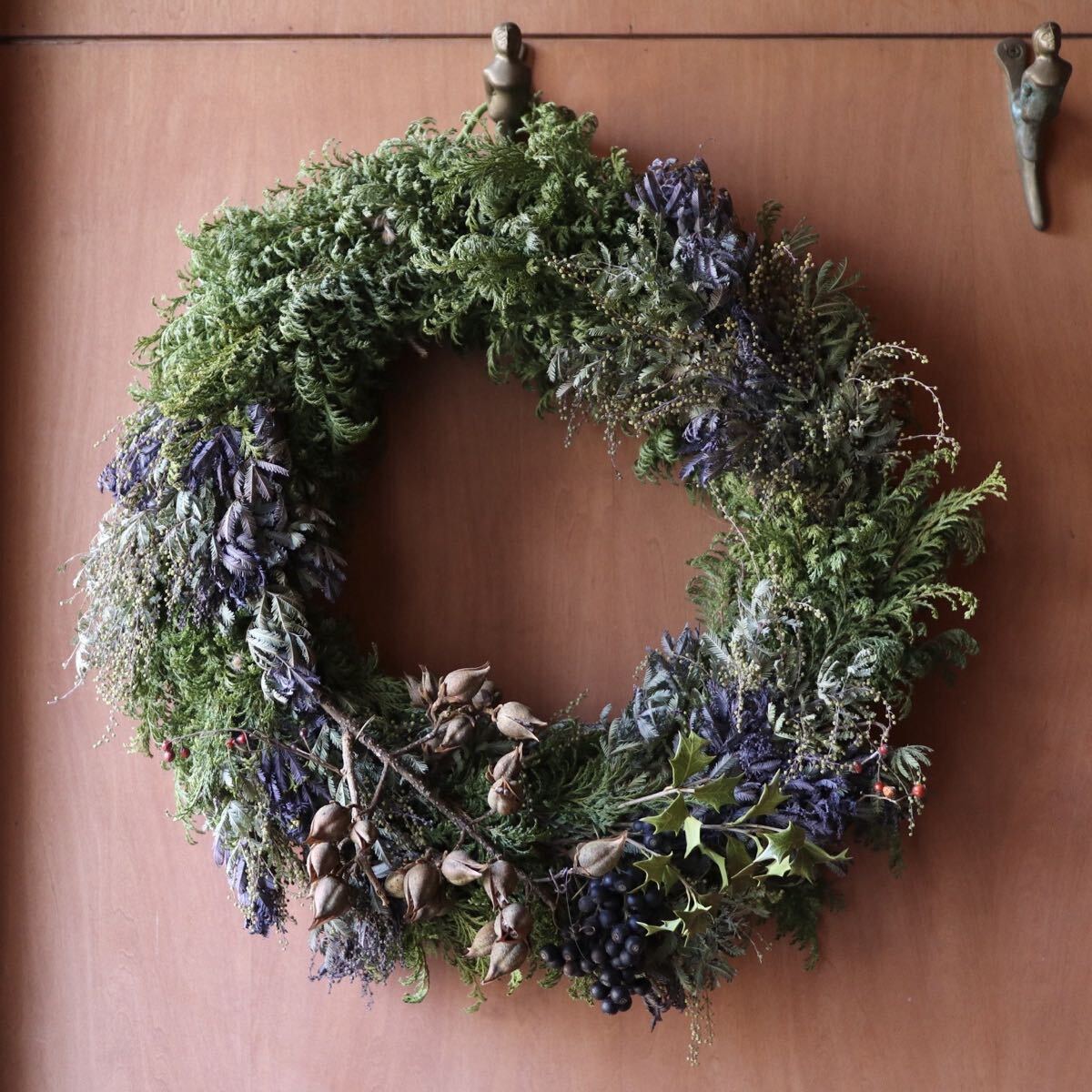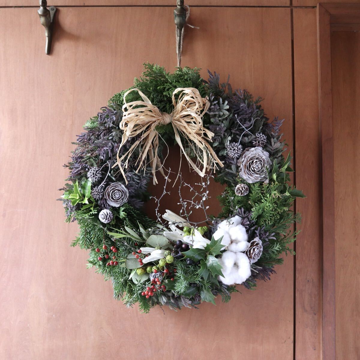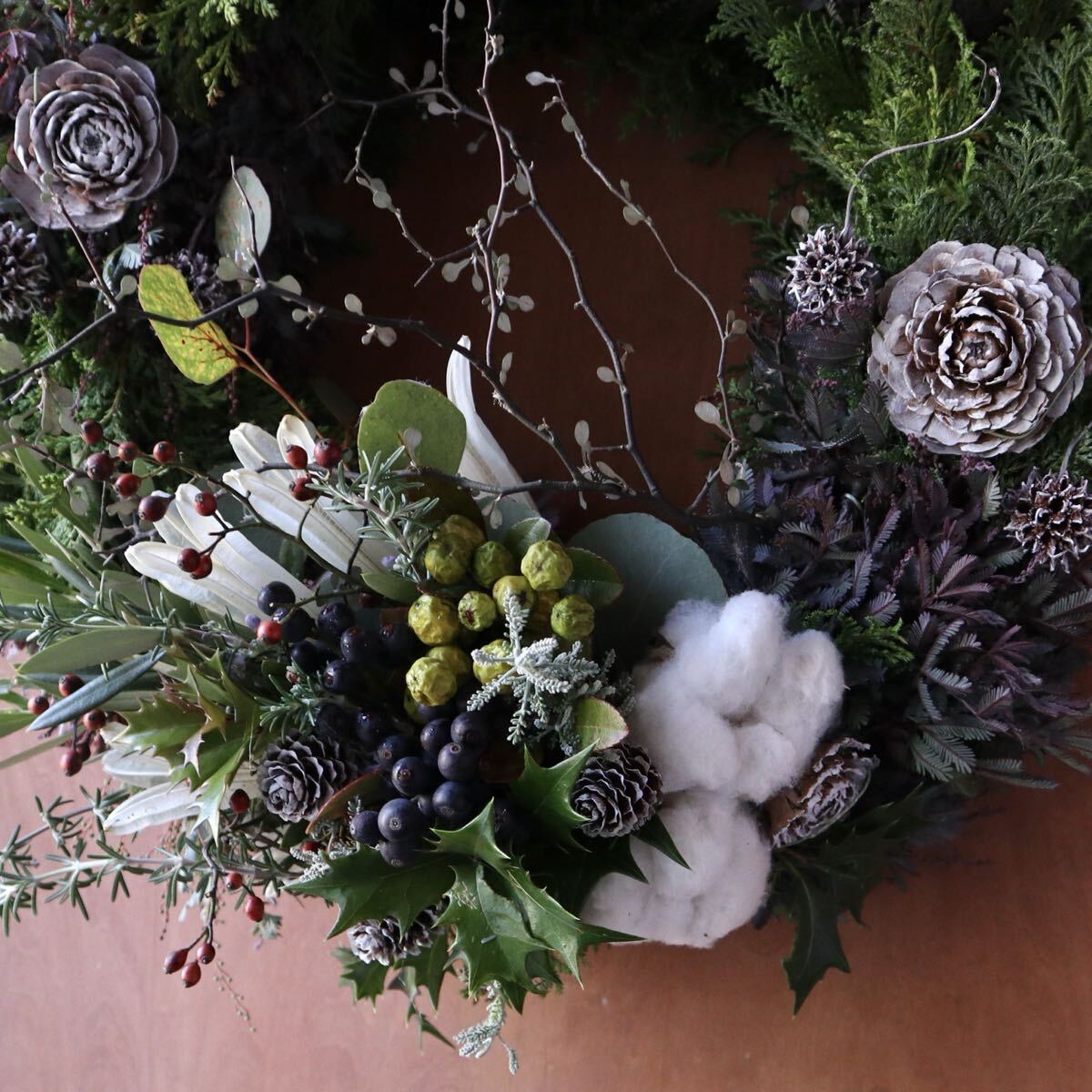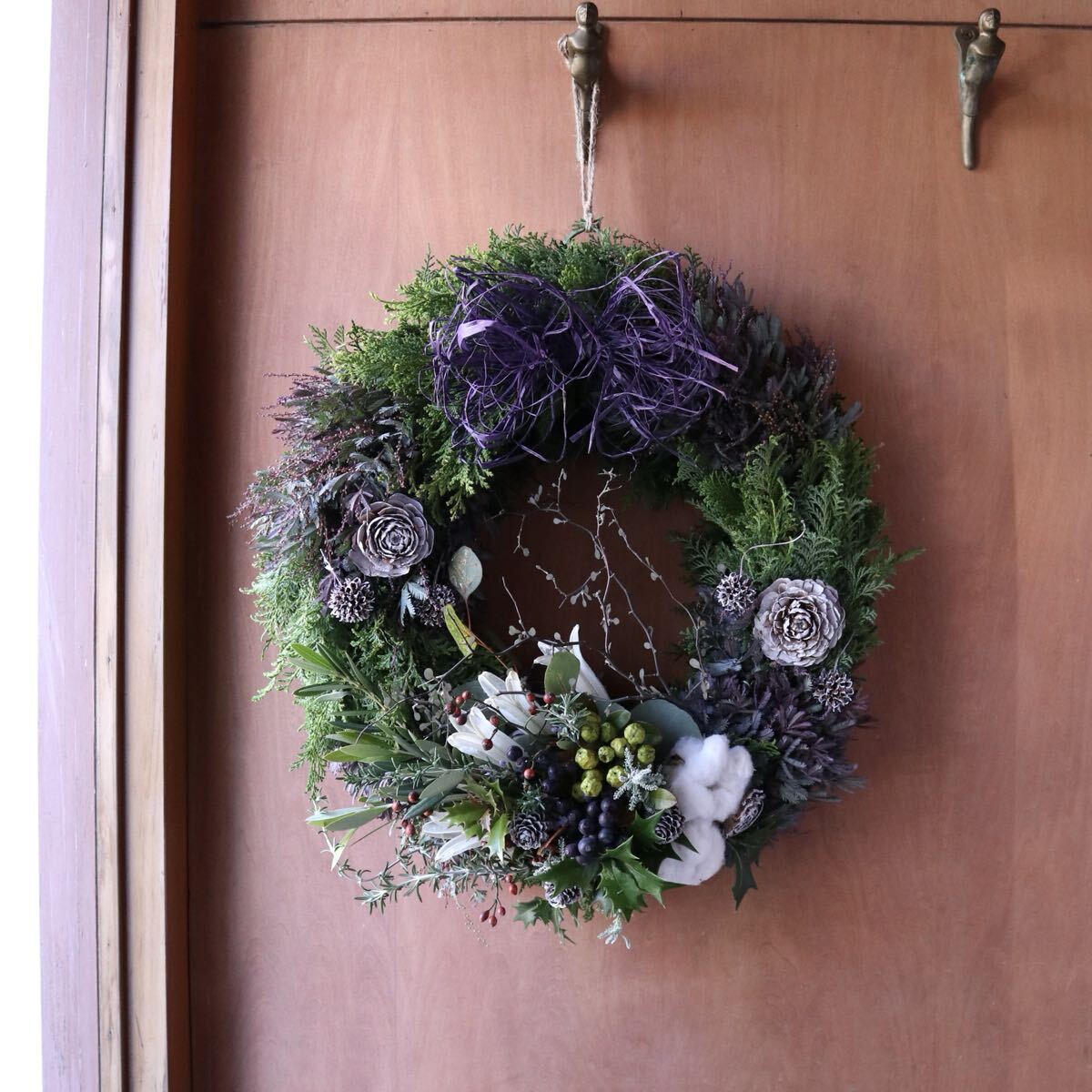※こちらのリースは75cmの特大スワッグ以外の作品と合計3点まで同梱可能です。同梱時は2点で送料+200円、3点で送料+400円になります。 ※ 11月15日以降の発送になります。 紫色の新芽が美しいミモザ(銀葉アカシアプルプレア)とヒバをベースに、ふわふわのコットンや実物をあしらいシックで大人っぽい雰囲気のフレッシュリースを作りました。ずっしりと重みがあります。 大きなラフィアのリボンがアクセントになっております。 フレッシュリースならではのヒバの香りをお楽しみいただけます。 全体的に生の状態ですが、徐々にドライになっていきます。クリスマスが終わったあとも、ドライのリースとしてお楽しみいただけます。 ラフィアのリボンはミモザの色に合わせたアンンティークパープルとナチュラルからお選びいただけます。 画像のリースはサンプルになります。 ご注文いただいた後に同じ雰囲気のリースをご希望のお届け日に合わせてお作りいたします。 植物ですので個体差があり完全に同じ風合いにはなりません。 毎日霧吹きで水を与えてあげれば直射日光が当たらない環境でしたら生の質感は1ヶ月半ほど維持できます。 そのまま水を与えずドライにした場合も質感は変わっていきますが色は3ヶ月くらいでしたらほとんど変わりません。 画像9枚目のリースは3ヶ月水を与えず飾ったものです。 特大サイズですのでお店のディスプレイにもおすすめです。 画像10枚目は梱包例です。 無料でリボン、メッセージカードもお付けできます。 使用花材 ミモザ(銀葉アカシアプルプレア)、ヒバ、コットンフラワー、ペイントしたシダーローズ、ラフィアのリボン等 直径45cm ※商品の性質上、輸送中のわずかな実や葉落ちはご容赦ください。 |