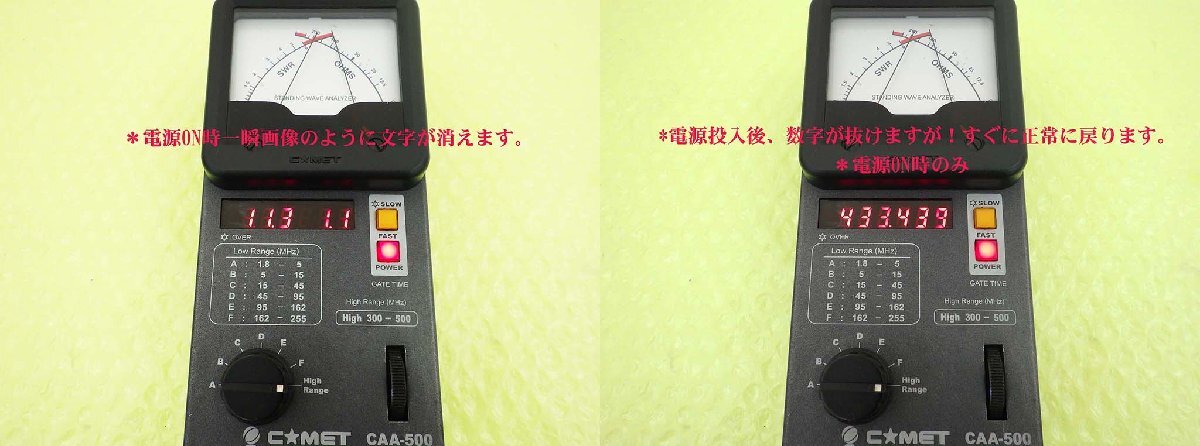 | ◆動作確認 | 【発覚難】 ◆デジタル表示のセグメント表示が異状に見えますが、肉眼では全く問題有りません。 ①電源投入時→ 一部表示が出ません。(一瞬) すぐに正常動作を表示致します。 *画像参照 ②430MHz帯のインピーダンス表示に大きく誤差が御座います。 *画像参照 ◆他 発覚しない不具合が有る可能性が御座います。 ご理解を頂ける方の入札を希望致します。 考え方によりは通常のSRWアナラーザーとして使用するには全く問題有りません。 殆どのアンテナ・アナラーザーのインピーダンスはあてに成りません! インピーダンスの調整は難しいところが御座います。 ただし、動作保証は一切致しません。 ジャンク品として出品致します。 |