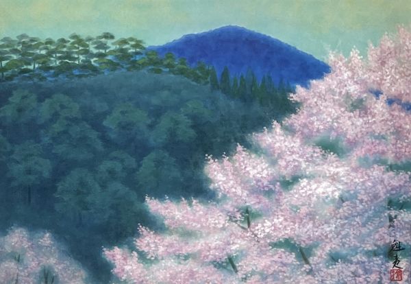 東山魁夷先生の代表作、桜の花と青い山を描いた美しい日本画。