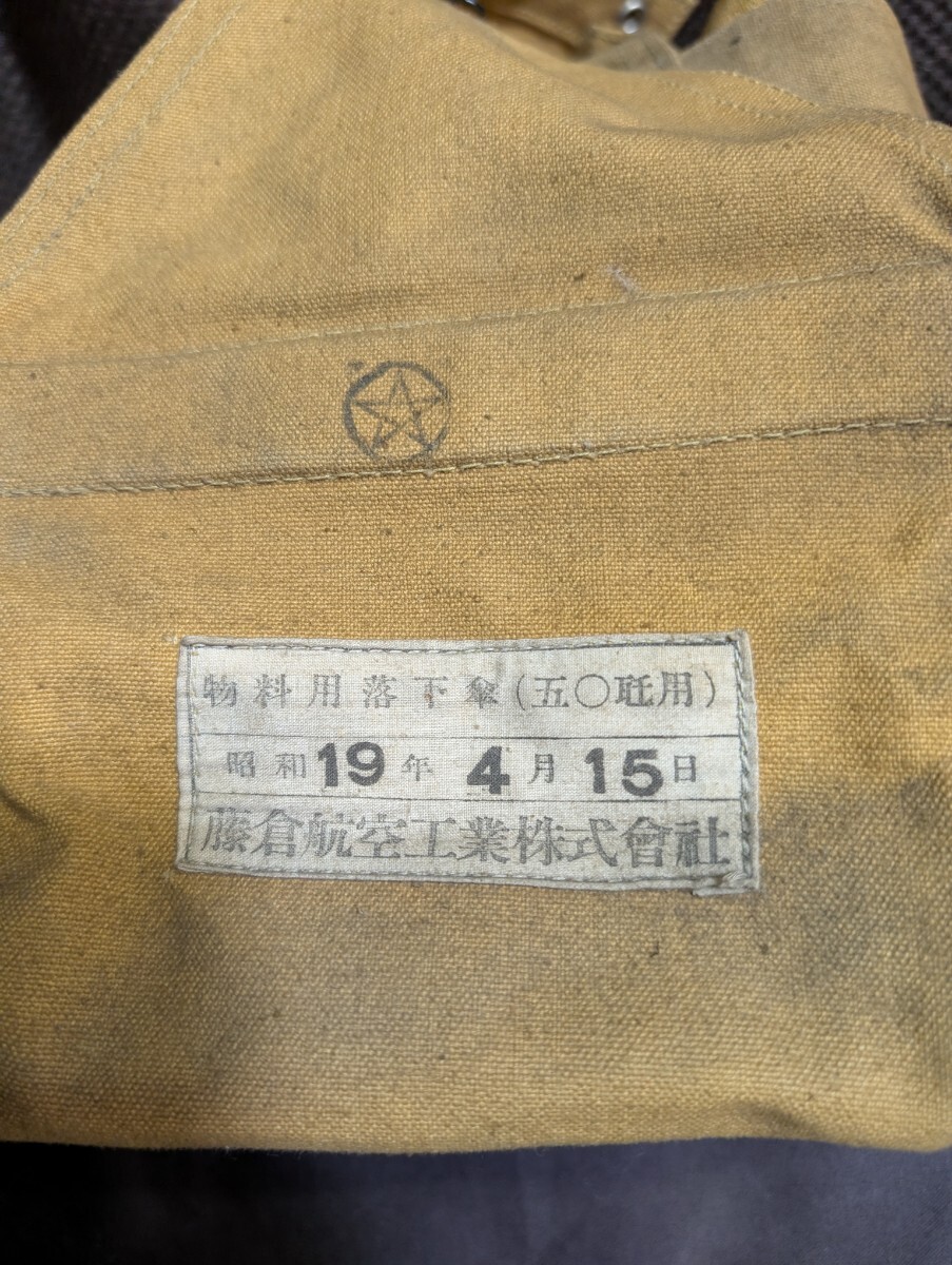 藤倉航空工業株式会社製 旧日本陸軍戦時物料投下用落下傘袋五0瓩用布製袋です。
