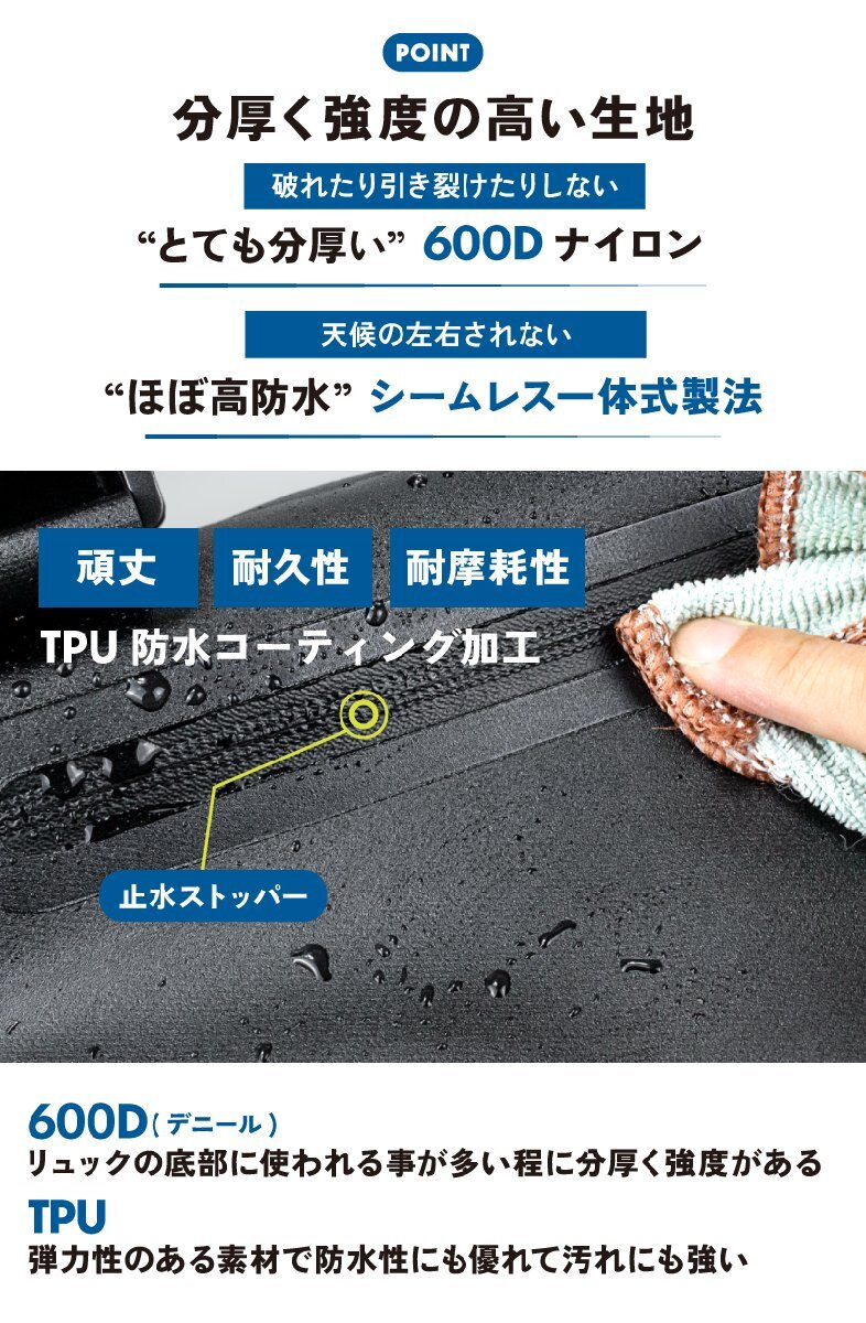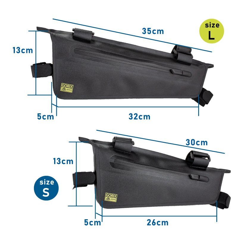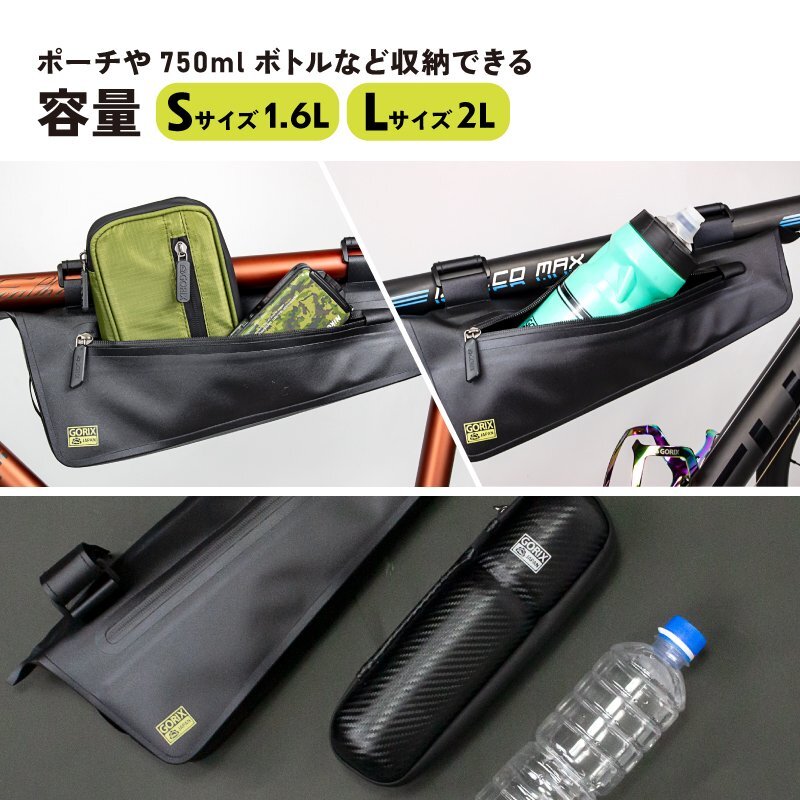 優れた防水性を持ち汚れや摩擦に強いとても頑丈なフレームバッグです。 生地には分厚く強度の高い生地を使用しシームレス一体式製法でさらに強力に。 水だけでなく汚れにも強いのが特徴です。 容量はLサイズで2Lでポーチや750mlのボトル、スマホなど収納できる十分なサイズです。 フレームの空きスペースを有効活用しバッグを装着する事で収納箇所を拡大。 シンプルでカジュアルなアウトドアデザインなのでどんなフレームにもぴったり。 SサイズとLサイズ、2タイプのサイズをご用意しています。 ロードバイクやクロスバイク、マウンテンバイクなどのフレームに取付けできる自転車用フレームバッグ。 ツーリングや長距離のロングライド、自転車旅、自転車通勤など様々なシーンで大活躍! [高防水] 防水性に優れた生地と縫い目のないシームレス一体式製法を採用し防水性を高めています。 表面に防水TPUコーティングとジッパーには防水性ファスナーを採用し防水性をさらに強化。 フレームバッグに付いた汚れも落としやすくなっています。 [強度が高い] 生地にはリュックの底部に使われる事が多い程に分厚く強度がある600Dナイロンを使用し強度を高めています。 擦れや摩擦にも強く破れたりするのを防止します。 [容量] 最大容量2LとSサイズが1.6L。水筒やチューブや鍵、工具や軍手、ポーチ、カメラ、薄手のウィンドブレーカーなどを収納。 大きく開く事で取出しがしやすくまた中身も確認しやすい! [ベルト穴] 自転車の装着に合わせて固定場所を変更できるベルト穴。 ベルクロなのでスムーズに取付け作業ができる。 商品内容フレームバッグ 生地分厚い600D ナイロン、表面防水TPUコーチング加工 (S)サイズ長さ26/30(下/上)cm, 高さ最大13cm, 幅5cm (L)サイズ長さ32/35(下/上)cm, 高さ最大13cm, 幅5cm 容量(S)1.6L / (L)2L 重量(S)180g / (L)200g | |
