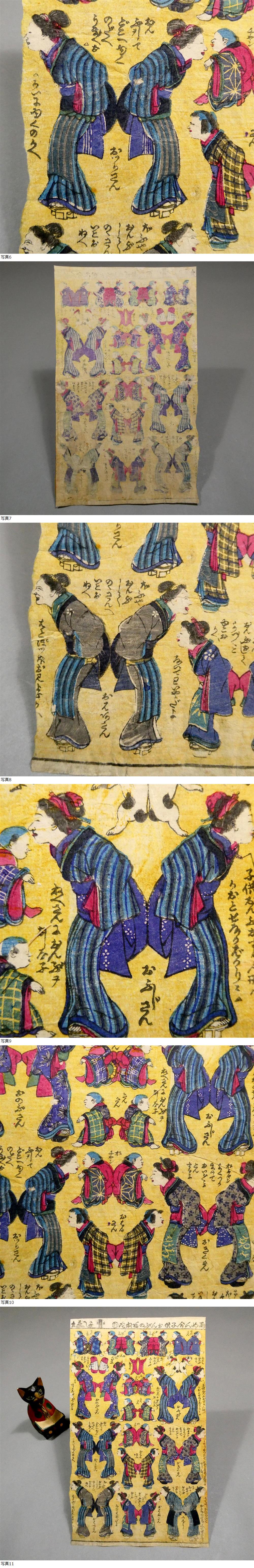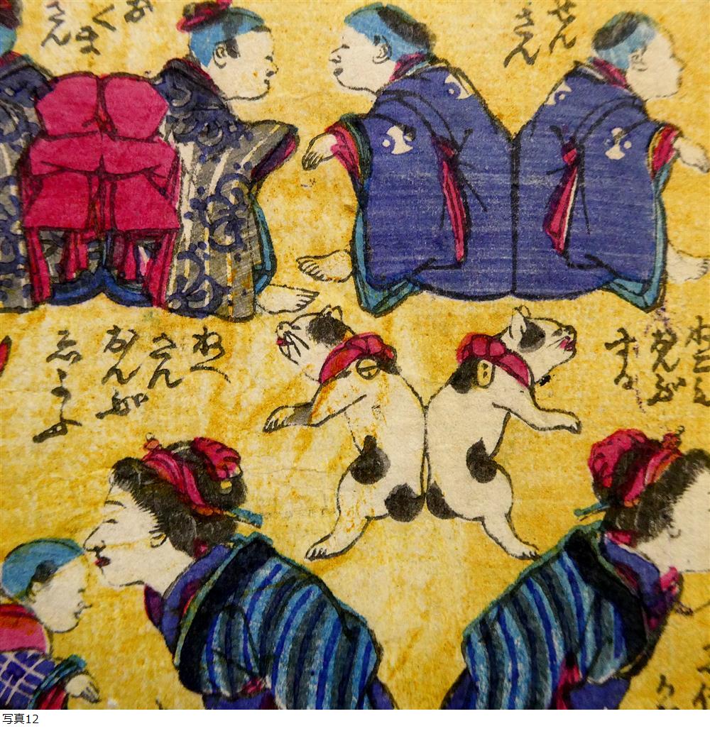■ “おもちゃ芳藤” 歌川芳藤 明治初年 木版浮世絵 おもちゃ絵 「両面合子供おんぶのあね様」 猫絵 子ども絵 ■