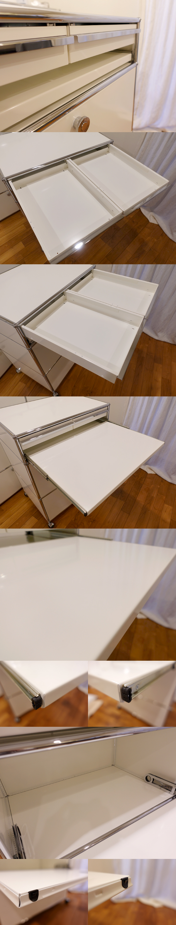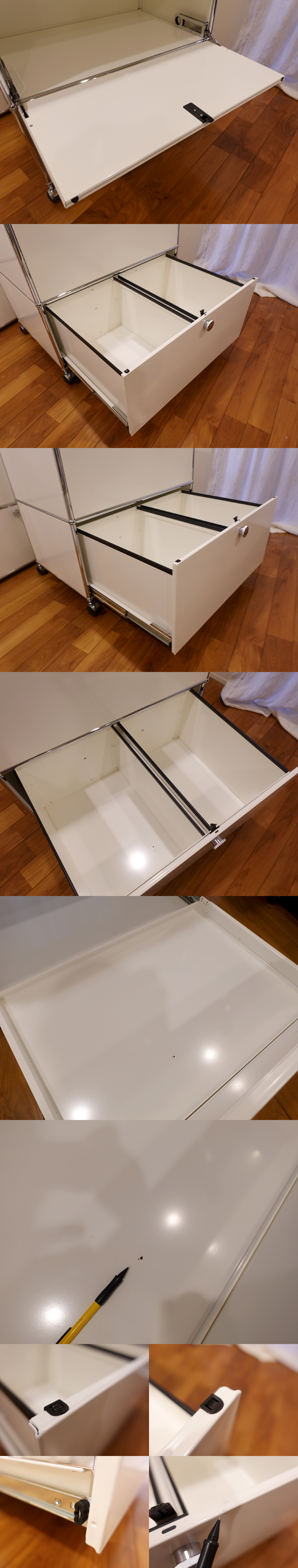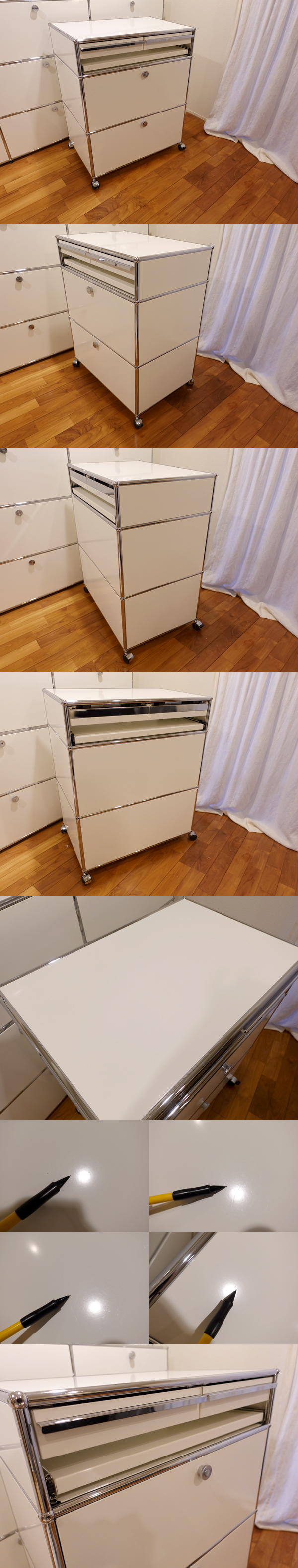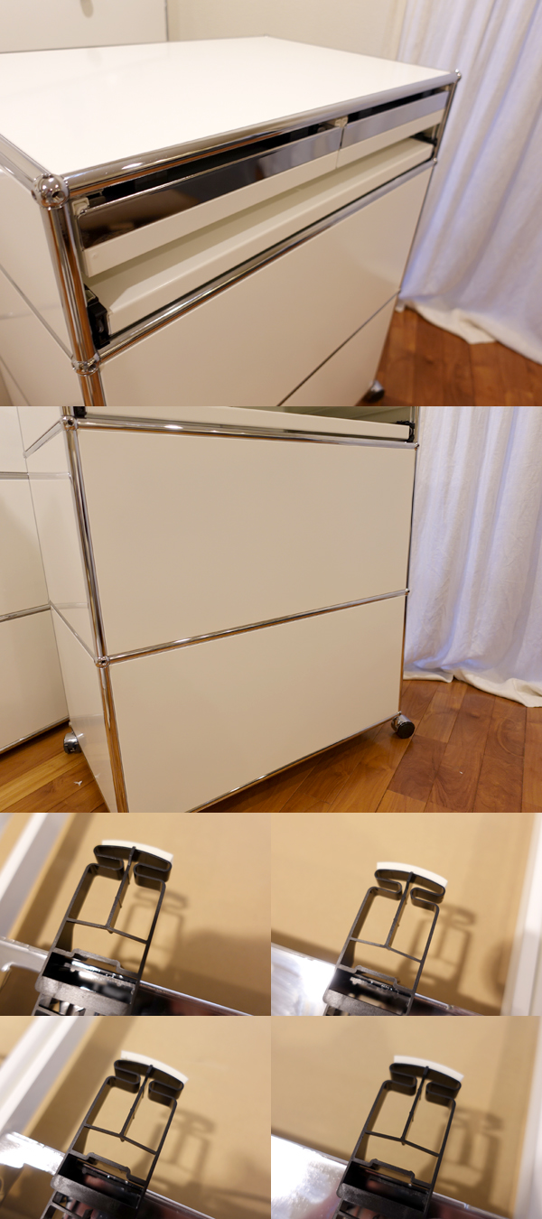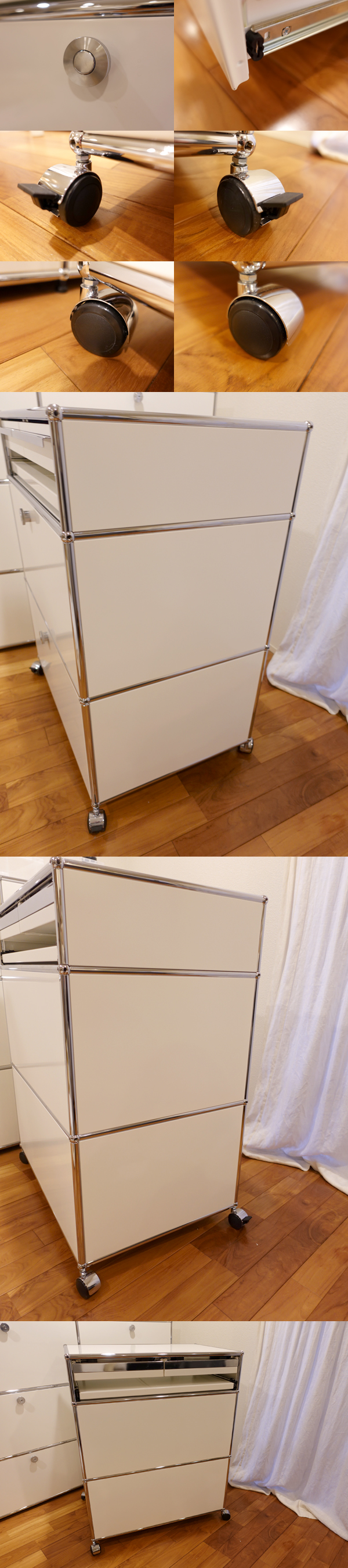 ご覧いただきましてありがとうございます。 建築家・フリッツハラーによるUSMシステム[中古品]です。 チューブとボールジョイントのきわめてシンプルな部材構成により、さまざまなユニットを形づくることができます。 こちらは1列3段仕様のキャスター式ワゴンユニットです。 パネルのカラーは定番の「ピュアホワイト」です。 幅750×奥行500mmモジュールで、高さは下段と中段が35cm、上段が17.5cmモジュール、総高さは96cm程度です。 上段は引き出し(ドロワー)が2杯ついており、ドロワー直下に、一時的な作業台やデスク代わりにもなる引き出し式シェルフが付いています。 中段は「ドロップダウンドア」。 下段は手前方向に引き出して使う「スライディングドア」です。庫内には、別売りの「メタルボックス」が付属しています。 収納量はかなりのものです。 キャスターは、手前の2つが「ロック機能付」のタイプです。 USMの定番ラインナップにはない仕様で、オーダー品になります。 コンディションですが、中古の状態で入手したものですが、特に目立つキズや使用感もなく、たいへん良好です。 天板パネルに、やや多くキズがついていますが、間近で見るとわかるようなキズですので、あまり気にならないかと思います。 下段の庫内に1箇所、5mmほどの塗装のはがれを伴うキズがございます。庫内ですので、あまり気にならないと思われます。 その他、外装、庫内などに特に気になる大きなキズはなく、たいへんきれいな印象です。 庫内もきれいですので、気持ちよくご利用いただけると思います。 表面塗装の強いハラーですが、商品の性質上、細かなスリキズは避けられないものです。目についたスリキズなどはできる限り写真に掲載しましたが、その他気にならない程度の小キズはございますので、あらかじめご了承ください。 製品の仕様上、上段ドロワー、下段シェルフを同時に手前に引き出しますと、本体が前方に傾く(倒れる)可能性がございます。ご利用時はご注意ください。 部品の点数も多く、見た目以上に重量がございます。感覚値ですが、80~90kgはありそうです。キャスター式で比較的移動もしやすいユニットですが、用途や利用環境を十分にご検討の上、お求めください。 |