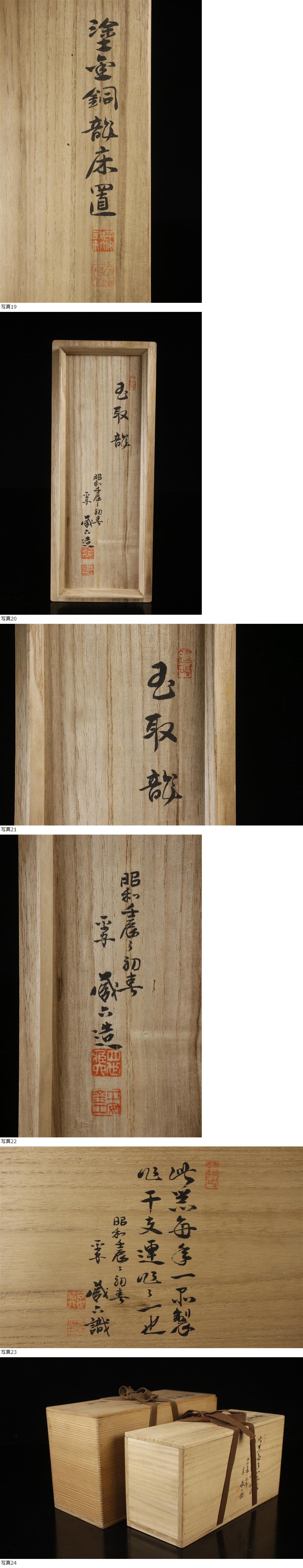 ⑪ 25121801* * * 商品詳細 * * * ここでしか出逢うことのできない唯一の美をご紹介させて頂きます。 四代秦蔵六による応需作品 干支連作の一点、玉取龍床置です。 細身で特徴的な姿をしており、その手にはしっかりと玉が握られています。 顔つきは精悍で、鋭い爪にしっかりと地に足を付けた姿も迫力があります。 金色の鈍く鮮やかな色彩は美しく、まさに神聖な生き物として神々しい存在感を放っています。 作者の高い技術と表現力が遺憾なく発揮された貴重な作品を この機会に是非お手元にてご堪能下さい。 四代 秦蔵六 1898年 生まれ 二代秦蔵六に師事 技術保存資格者 京都金属工芸協会長 1984年 逝去 ■商品内容/置物、共箱、二重箱 ■サイズ/横26cm×高12.5cm×奥行9㎝ 重量1.3kg 箱:横29.5cm×高15.5cm×奥行11.5㎝ 箱:横31cm×高18.5cm×奥行14㎝ ■状態/スレ、小キズ、サビ、箱にスレ、小キズ、パーツ外れ、シミがございます。 ※写真にてご確認、ご了承の上ご入札下さい。 * * * 支払詳細 * * * !かんたん決済 * * * 発送詳細 * * * 入金確認後3営業日以内に発送致します。 ※直接引き取りも可能です。 60~160サイズにつきましては 佐川急便、ゆうパックのどちらかで発送いたします。 ゆうパック発送の場合、弊社の発送日から追跡サービスに問合せ番号が反映されるまで 約1日ほどお時間がかかりますのでご了承下さい。 * * * 注意事項 * * * 運送中の破損があった場合は速やかに当社までご連絡下さい。 保険を利用するのに受取連絡後に運送会社による現場での破損状況確認が必要となります。 勝手に返送されますと保険の適用外となりますのでご注意ください。 * * * * * * お問い合わせ:082-236-8669 |