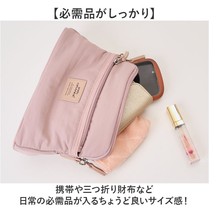 | 商品説明 | ・・【2WAYで使える】 ・ポーチにもショルダーにもなる便利なミニショルダー。 ・【2層収納で整理上手】 ・メイン収納が2つに分かれているから荷物の仕分けも楽々◎ ・【必需品がしっかり】 ・携帯や三つ折り財布など日常の必需品が入るちょうど良いサイズ感! ・【前面ファスナー付き】 ・すぐ取り出したいものを入れられる前面ポケットで使い勝手抜群〇 ・【ショルダーを外して】 ・ストラップを取り外せばポーチとしても活躍する2WAY仕様♪ ・【便利なポケット充実】 ・リップ用ポケットやメッシュファスナーなど小物整理が捗る。 ・【シンプルカラー展開】 ・どんなコーデにも馴染む使いやすいカラーバリエーション。 |