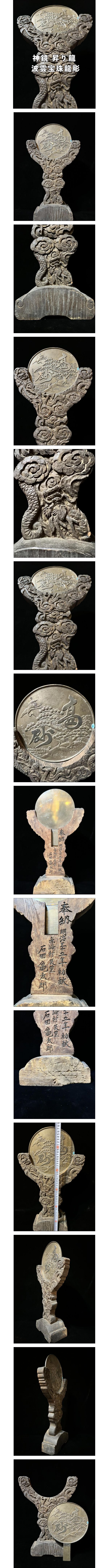 | 商品説明 | 神鏡 波雲宝珠龍彫 古鏡 神社仏閣 奉納鏡 特大 直径約57cm 奉納 明治三十五年 赤崎村の出品になります。 左部、土台から渦巻く昇り龍の彫りの迫力が素晴らしい逸品です。 土台裏に削れがありますが他、特筆すべき破損は見当たりません。 画像にてよくご確認下さい。 サイズ 最大 57.5cm ※古鏡含む 【画像無断転載、転売について】 弊社は海外へ直接出品しています。 弊社出品物を海外サイトへ無断画像盗用にて販売されている事を 発見した場合、即座にVero通報及び法的訴訟の対応及び即時出品物を購入、 当出品を取り下げいたします。 無断転載、転売は絶対に許しません。 ・品物に年式が記されている物以外の制作年月はあくまで当方の主観、または入手時に前所有者より聞き及んだ年代です。参考値としてご理解下さい。 ・1円、1000円などの低額スタートにて想定より大幅に金額が到達しない場合や また記載項目と実際の品に乖離があった場合を出品取り下げる場合がございます。 入札後の取り下げは出品者の権利として上で認められております。 当出品は営利で運営しており不用品等の譲渡ではない為、ご理解の程お願い致します。 その場合、定額にて再出品させて頂きますが、初回の1000円スタートでの落札価格が最も安価に入手できる機会となる為、初回の定額スタートにて入札をお勧めいたします。 |