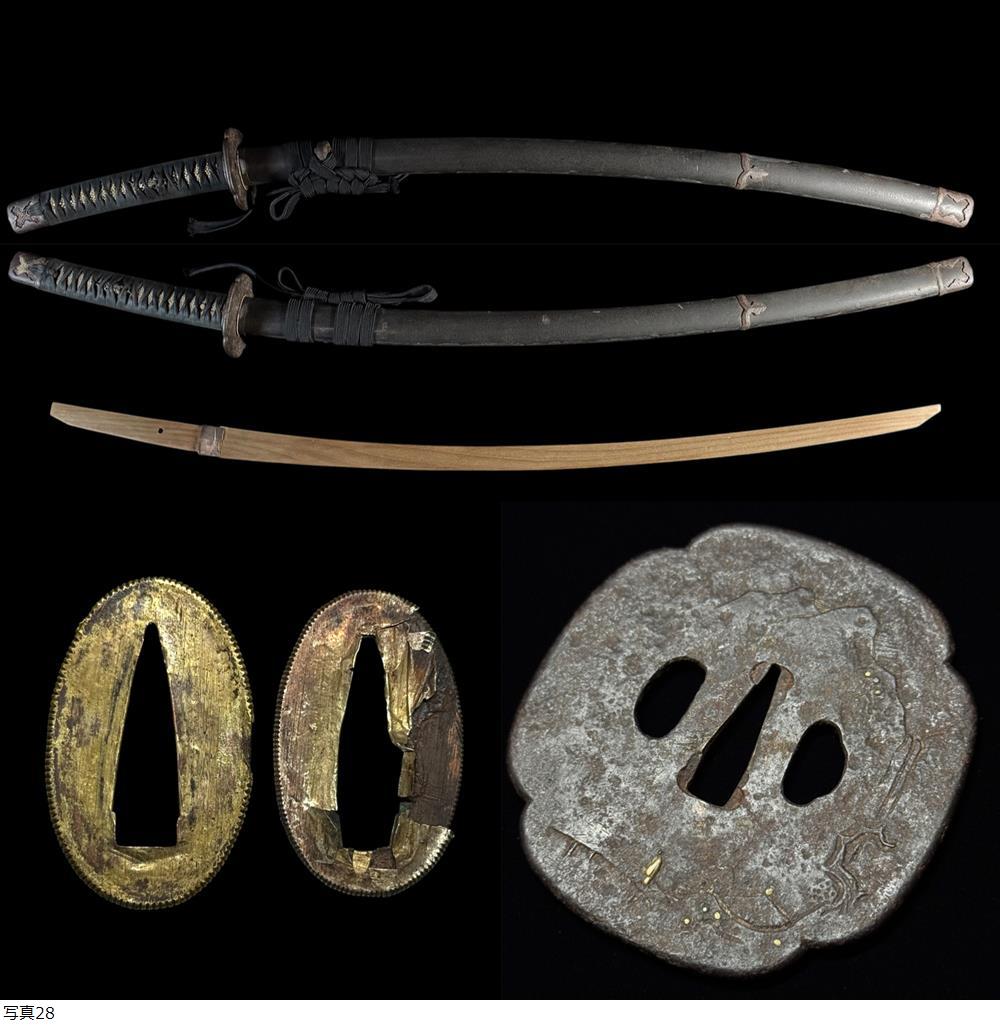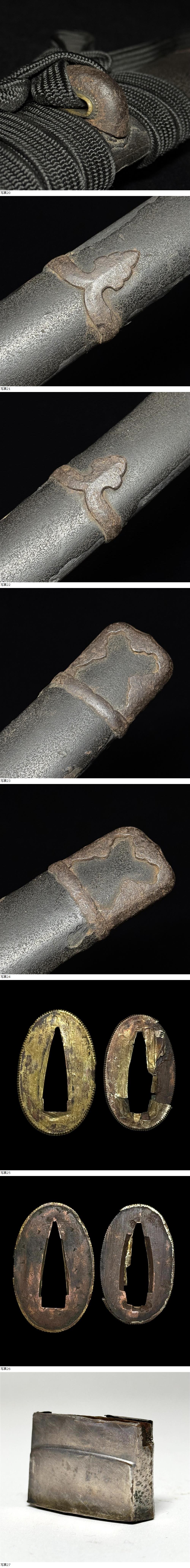 時代 半太刀拵 鉄地金具一作 鍔(銘)金家 金着せ切羽 銀着せハバキ 竹光 (検) 刀装具 拵 拵え 小道具 日本刀 太刀 刀 【法量】全長97.6cm 柄23.8cm鞘73.9cm 【竹光】全長83.8cm 刃長67.7cm 反り2.6cm 【重量】553g 【本作は江戸末期から明治初期頃の半太刀拵になります。 金物は、縁頭・鯉口・栗形・責金具・鐺が鉄地一作で鍔は金家と在銘になります。 切羽は金着せでハバキはサイズが合っていませんが銀着せハバキが付いています。 竹光が入っています】 しっかりと写真と説明文をご確認してからの、ご検討とご入札をお願いいたします。
