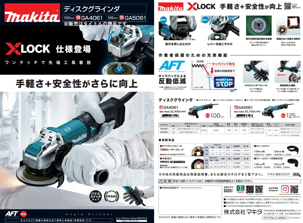 マキタ makitaディスクグラインダGA5061■砥石交換が簡単&スピーディ[X-LOCK]採用AC100Vディスクグラインダ。ワンタッチで先端工具の着脱が可能。■取付けは砥石を押し込むだけ■取外しはレバーを起こすだけ■砥石の締め過ぎ緩みを低減フランジ不要、締め過ぎや緩みが起こりにくい。■間違えない先端工具取付決まった方向のみ取付け可能な形状。■キックバックによる反動低減※注意:本機能はキックバックそのものを防止するものではありません。■パドルスイッチ+ブレーキスイッチを離せばピタッと止まる。■再起動防止機能スイッチを握っている時に誤ってコードを挿しても起動しない。■ホイールカバー調整・着脱■フラットな角度で研削可能■その他特長・ソフトスタート・カーボンブラシ外交換可能・サイドグリップ上部取付可能88381767163