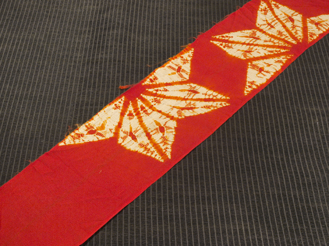 やや沈んだ猩猩緋(しょうじょうひ)色の地に、縫い絞り染めで麻葉(あさのは)の文様が施されている、縮緬のはぎれです。 明治期ごろにつくられたと思われるアンティークのお品です。大きめのシボの縮緬地です。 両耳付近に縫い跡があり、その縫い跡にヒケている部分がところどころにあるほか、絞りの縫い跡にもヒケている部分がところどころにあります。また、上半分の中央に縦にヒケがあるほか、下端付近の中央にも直径約 5mm 前後のヒケ穴がちらほらとあります。そのほかに目につく大きなしみやよごれ、褪色などのダメージはなく、この時代のものとしてはきれいな状態です。生地の力はあります。風楽の出品内で同じ柄の寸法違いのものを複数出点している場合もあります。 |