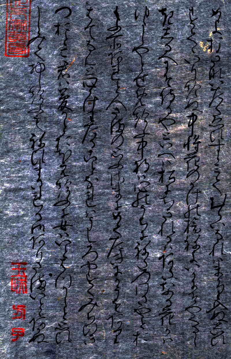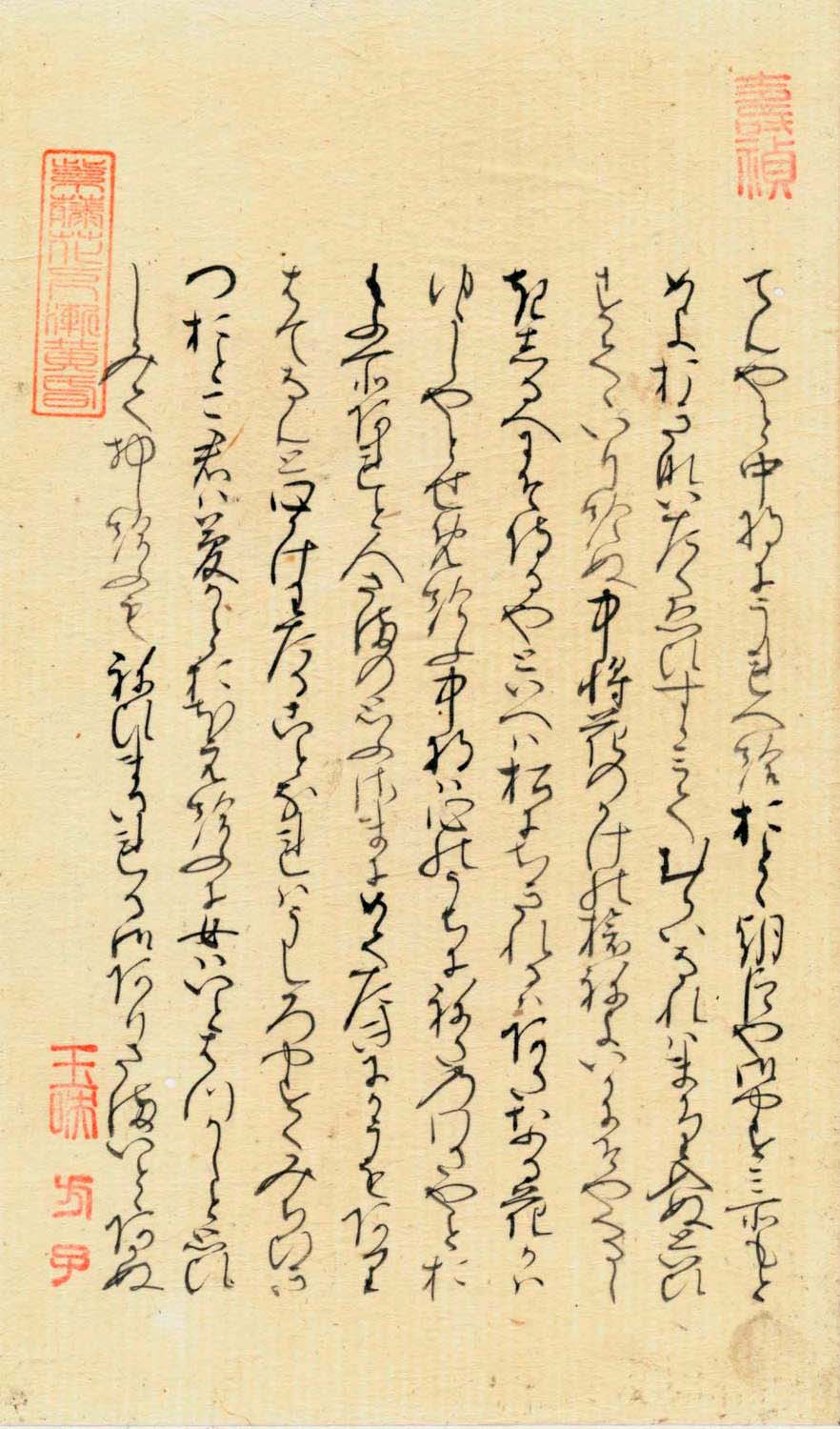 原文上部に「紫藤花下漸黄昏」(紫藤の花の下、漸(ようやく)黄昏(たそがれ)という漢詩文の落款が押捺されている。この漢詩は「白楽天」に由来するものです。 源氏物語「藤裏葉」原本に記されております。紫式部が「藤裏葉」を書くに際し、「白氏文集」の漢詩を熟読したうえで「源氏物語」の「藤裏葉の巻」を書いていることがわかります。この原詩の言葉の引用は、「藤裏葉の巻」に用いられていることで広く知られている。紫式部がこの原詩に親しんでいたと推定されている。 |