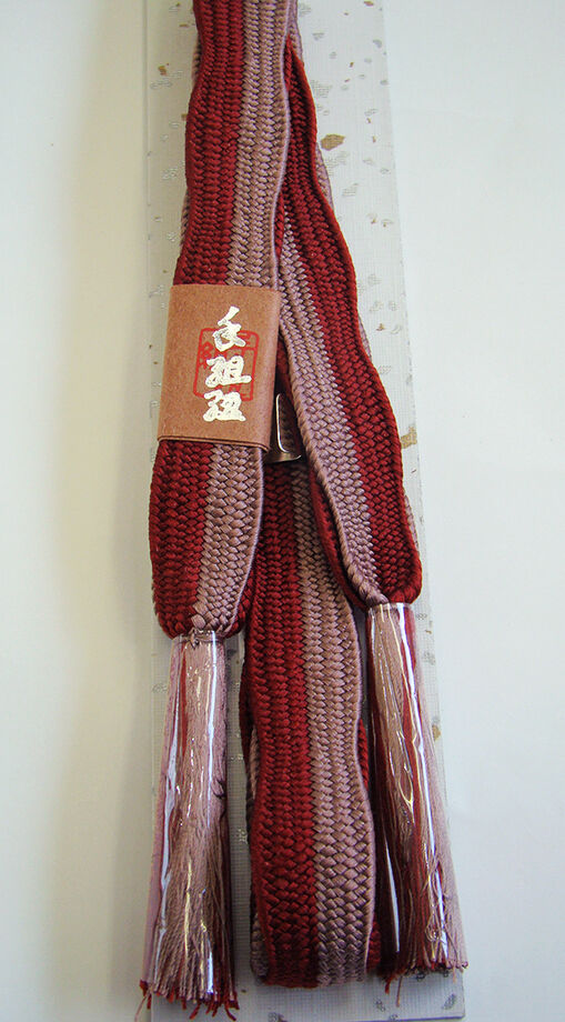 ●帯揚げ: 正絹。 しなやかなさらりとした滑らかな重めの極上綸子地、 渋い蘇芳香色地に道長の地模様入りに花木柄の金彩染。 長さ175cm 幅30cm ●帯〆: 正絹。 平組。 梅鼠色と渋いエンジ色の伊賀組の組紐。 長さ165cm 幅1.5cm |