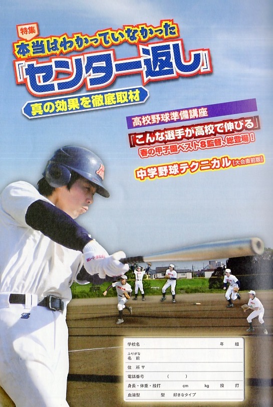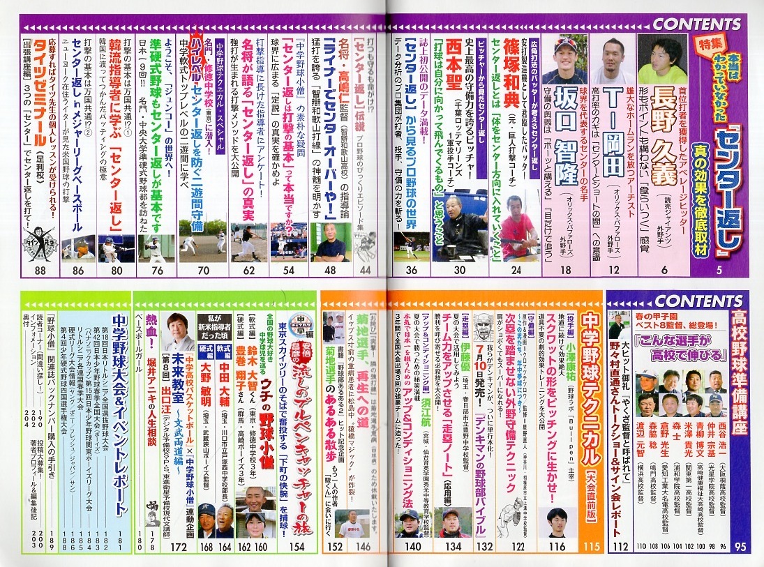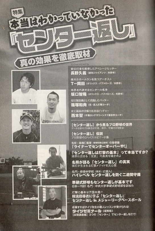 | 特集 本当はわかっていなかった「センター返し」 真の効果を徹底取材 「センター返し」の匠 篠塚和典(元巨人打撃コーチ) 西本聖(ロッテ投手コーチ) 高嶋仁(智辨和歌山高校監督) プロ選手インタビュー 長野久義(巨人) T-岡田(オリックス) 坂口智隆(オリックス) | |||