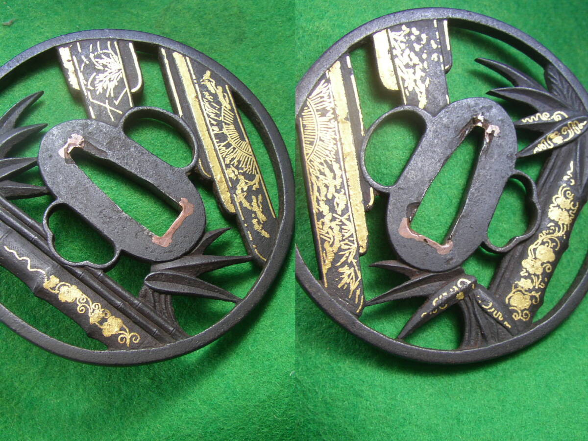この度の鍔は強靭に鍛錬した若干大振りの鉄地を「丸形」に仕立て切羽台から耳に向かって若干肉を付け「肉彫り透」し「角耳」にし「小柄櫃・笄櫃」を開け「竹の図」を構図良く「肉彫地透」で丁寧に仕立て