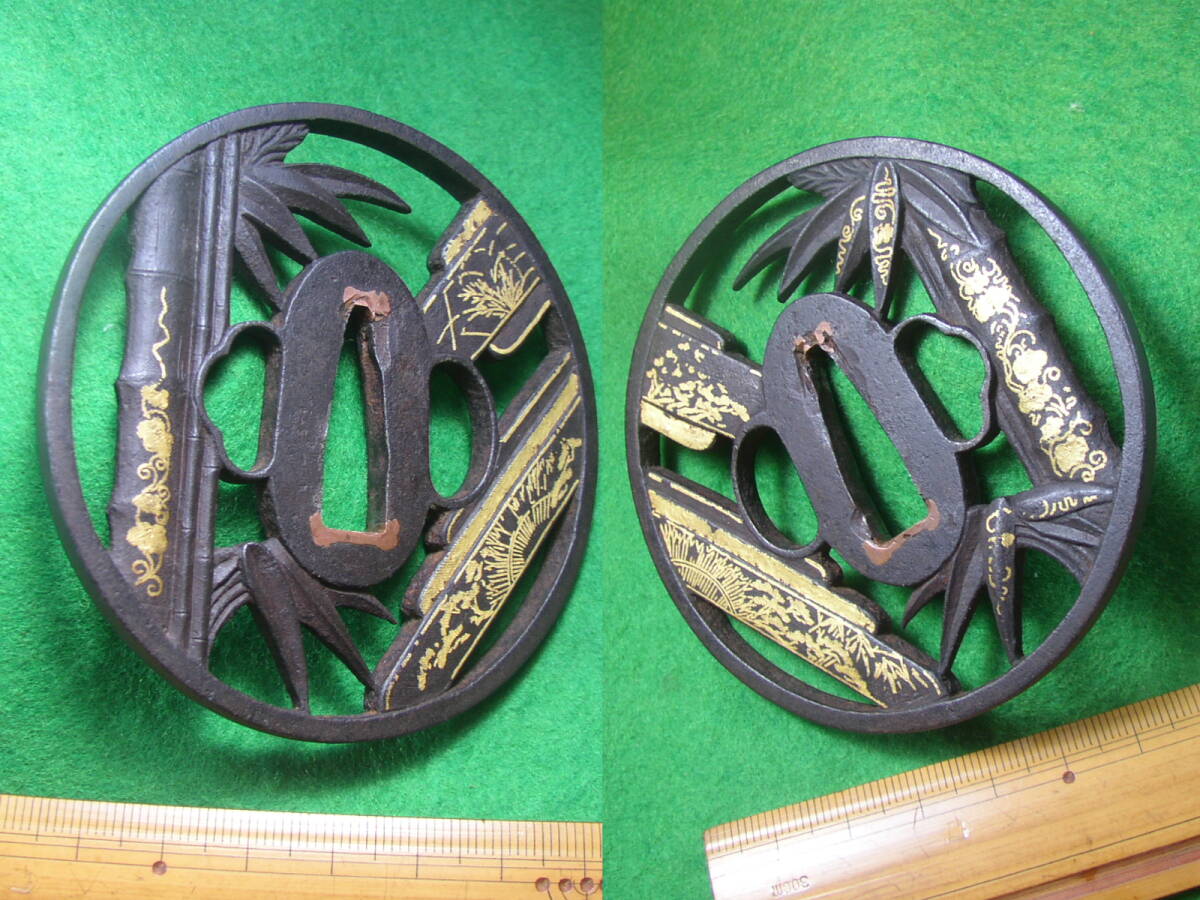 「花唐草・松竹・野草」等々を「金布目象嵌」で華やかで美しく施し「雅」で「品位」に満ち見栄えし趣良く仕立てた江戸中期頃の「時代物」としては出来栄え保存状態が共に最上々の大鍔です。