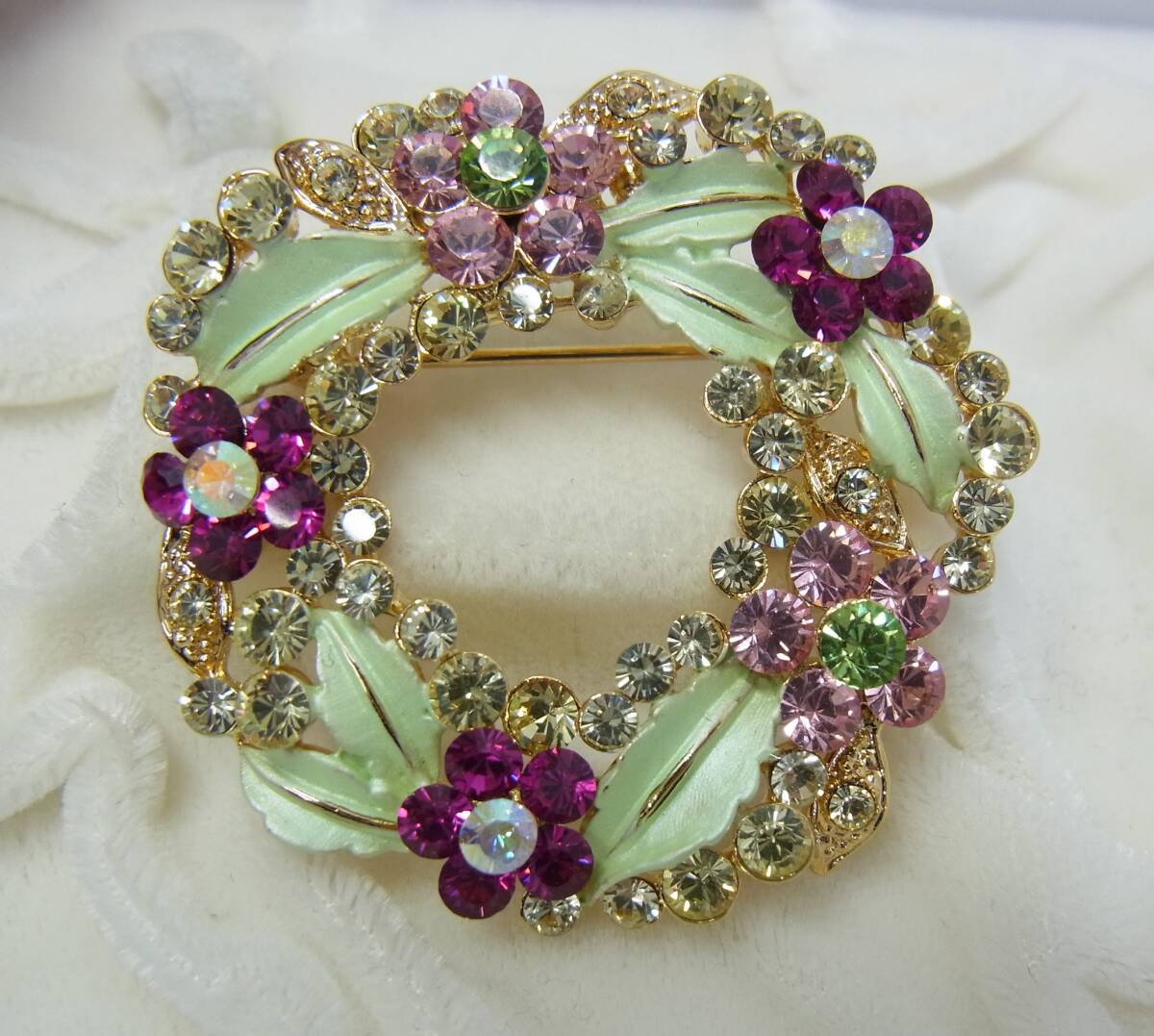 | キラキラ☆フラワーリース デザイン ブローチ☆ラインストーン ゴールドカラー 花 フラワー リース リング ビンテージ アクセサリー 60 | ||