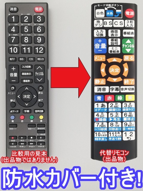 | 【商品名】 ジョワイユ JOY-TVPVR 代替リモコン 【対応機種】 JOY-50TVPVR JOY-40TVPVR 上記機種以外については、質問欄よりメーカーと型番をご連絡頂ければ、対応品のご案内をしております。 【商品について】 右側の代替リモコンが出品物になります。左側のリモコンは見本画像です。 タイトル機種のリモコン信号を入力した設定不要ですぐ使える純正品と同等の代替リモコンです。 リモコン左上のモード切換ボタンにて、各機能のボタンをお使いいただけます。 商品に不具合があった場合は代替品交換かご返金にて対応させて頂きます。 【付属品について】 防水リモコンカバーをお付けします。 ボタン機能を印刷した薄型フィルムはリモコンに貼付け済みです。 乾電池は付属しません。別途ご用意下さい。(単4乾電池×2本) 【発送について】送料無料 迅速発送を心掛けております。土日祝日はお時間を頂く場合ございます。 ポスト投函配達となり、日時指定は出来ません。 | ||