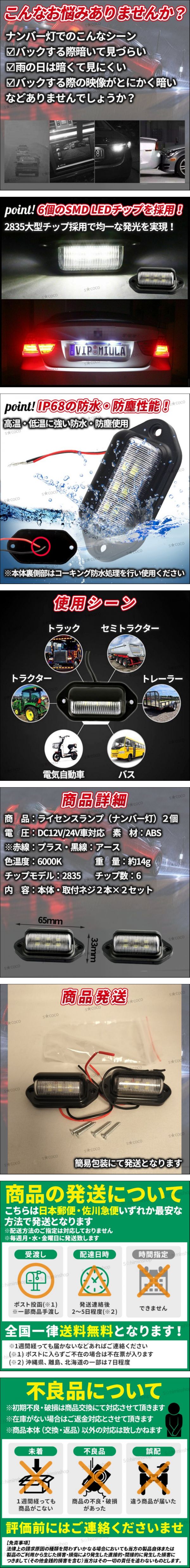 ライセンスランプ2点セットになります! こんなお悩みありませんでしょうか? ●ナンバー灯でのシーンで【バックする際に暗くて見づらい】【雨の日は暗くて見にくい】【バックする際の映像がとにかく暗い】など 高輝度SND2835チップ6発を採用で効率のより発光を実現! バックランプとして車両後退時に後方の視野性の向上が期待できます 12V/24V車対応なので、トラック・トレーラー・トラクター・バスなど幅広い車種に対応 ! | ||