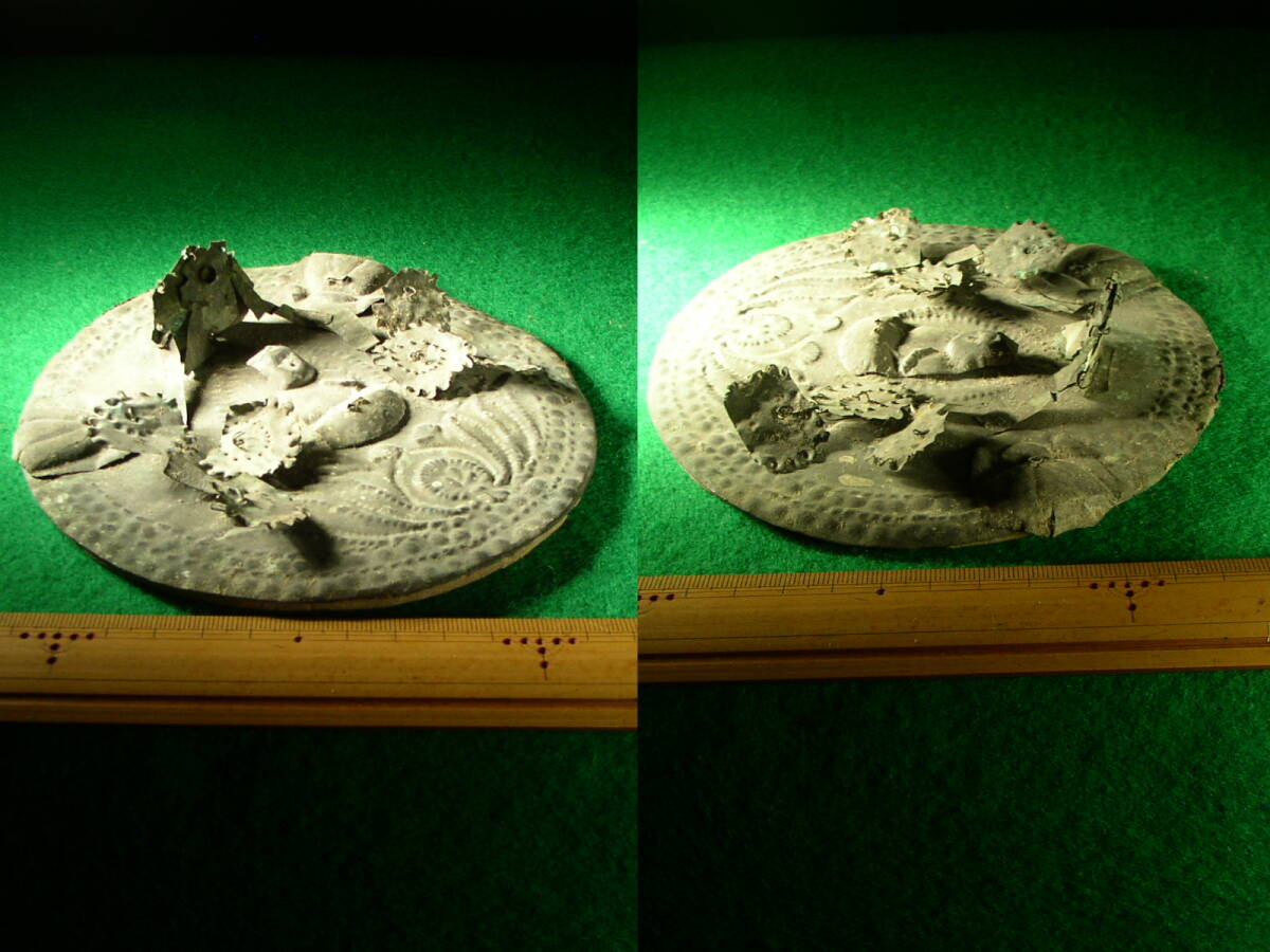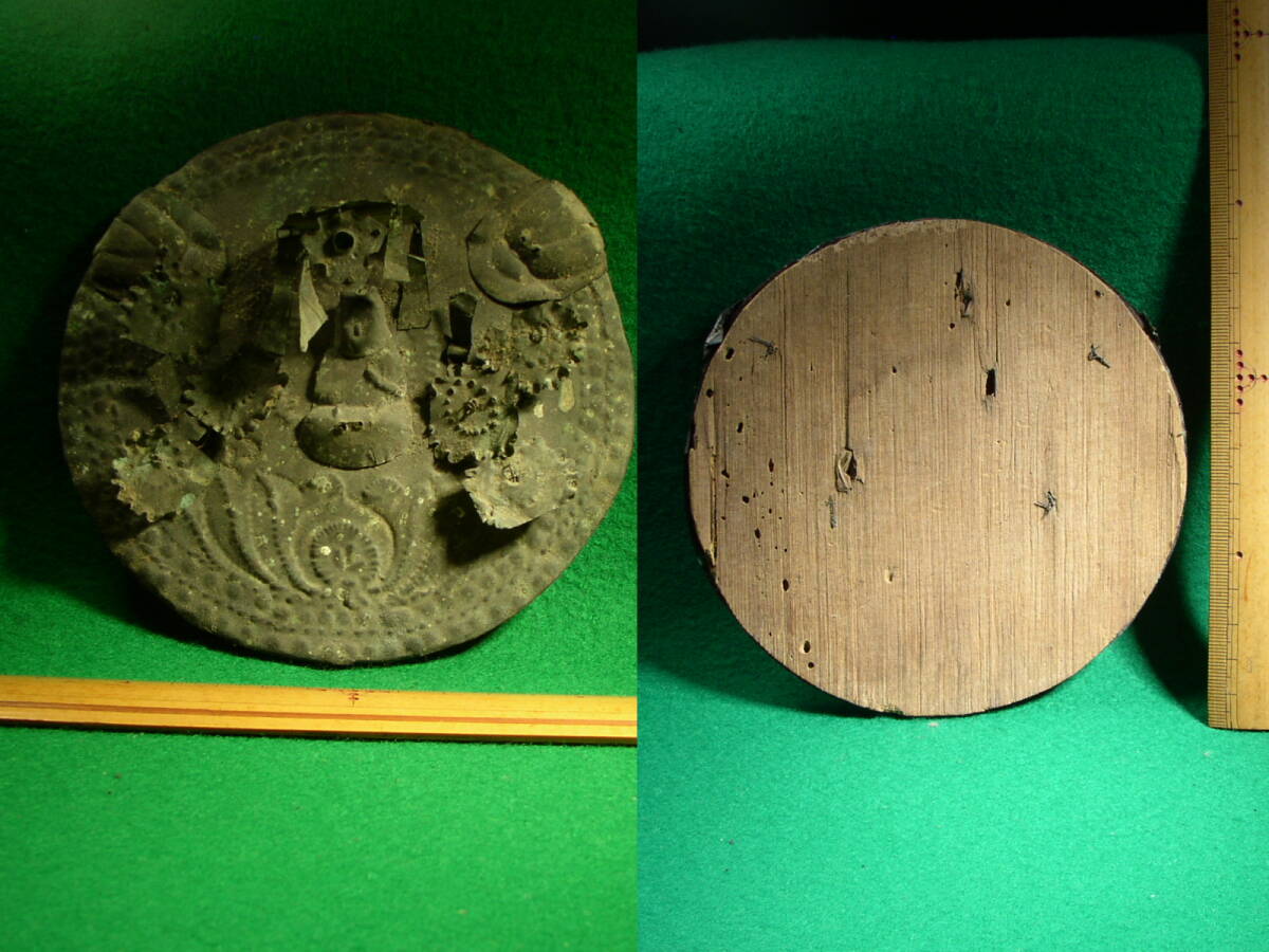 この度の「伝世」された「掛仏(カケボトケ)」は「盤」の「鏡面」の全体の薄銅板を円面にし「側」の」全周に「縁飾り鋲」を中央部に「光背」を下部に「蓮弁」を打出し彫り