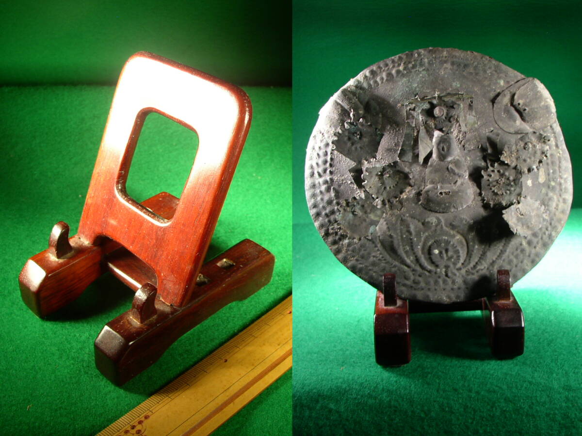「盤」の裏面の「宛木板」も表同様に初心の状態で「古味」豊かで「掛仏(御正体)」同様にまだまだ 存在感ある佇まいで、室町中期の仏教美術を充分に楽しめます。(飾り台が付いていますので机上でも飾れます。)