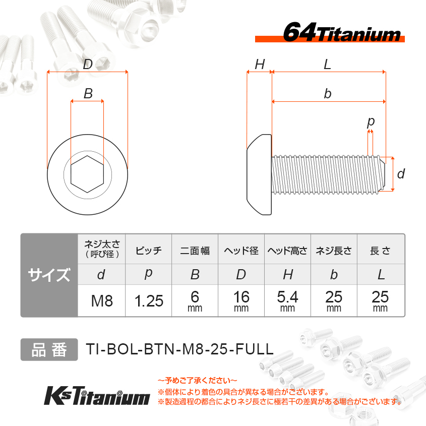 64チタン製ボタンボルト M8×25 全ネジ ピッチ:1.25 スレッド長:FULL(全ネジ) のチタンボルトです。| 出价者 | 信用 | 价格 | 时间 |