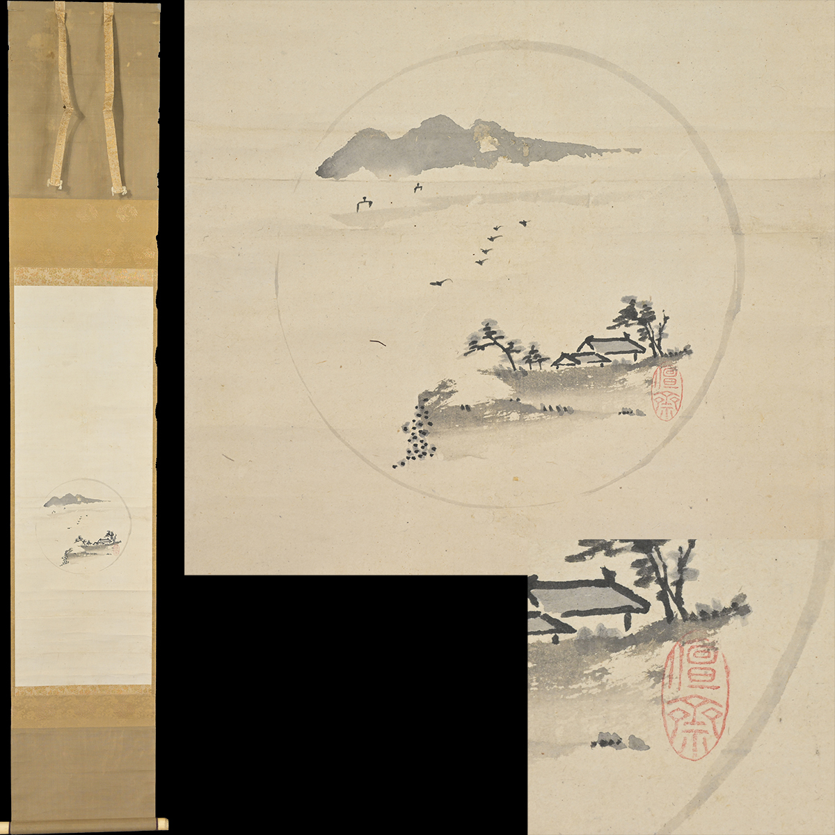 近現代の京都画壇にまで系譜が続く「円山派」の創始者で写生を重視した画風が特徴です。鹿野派の絵師石田幽汀に師事し、初期は眼鏡絵を描き生計を立てており、オランダ渡来の作品から西欧の遠近法を学びます。中国画までを含む様々な流派の画風を学び、写生を重視し、東洋画の伝統である装飾的な絵画用七を合わせた独自の画風を確立しました。 ご覧いただきありがとうございます。掛軸のコレクションを同時に出品中です。 併せてご検討ください。よろしくお願いいたします。 寸法 全長 約 142.5×30cm 本紙 約 69.5×24cm 紙本肉筆、未鑑定につき、ガイドラインに基づき模写といたします。 軸先少し欠けております。 その他、詳しくは画像にてご確認ください。 | ||