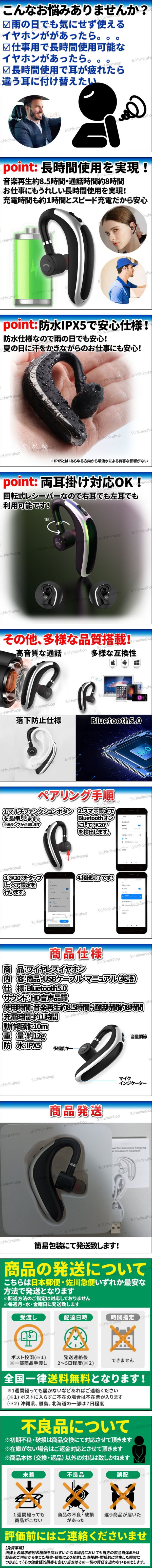 ご覧頂きありがとうございます! 耳掛け式Bluetoothイヤホン(片耳仕様)の紹介です! 片耳タイプのワイヤレスイヤホンになります 片耳が空いていることでドライブ・スポーツ・ビジネスに最適でながら作業にぴったり! 回転式レシーバー仕様のため右利き・左利き両方対応OK 長時間使用しても耳に負担がかかりにくい仕様となっております 是非、ご利用ください! | ||