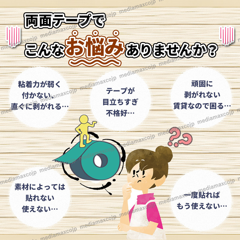 まるで魔法の様な超強力!両面テープ 両面テープを使えば強力な粘着力でしっかり固定。 貼って綺麗に剥がせ、ぬるま湯で洗えば 何度でも繰り返し使えます。 家具やカーペット留めや、リモコンやスマホを壁に貼り付けたり 愛車にとあらゆる場所で使えます。 透明で目立たないので 家中のあらゆるスペースが活躍の場に アイデア次第で使い方は無限大です。 壁に掛けている物やタンス、椅子の固定に。 自然災害の対策にも最適です。 ※注意:壁紙に貼る場合、壁紙のノリ付が弱いか、 重量に耐えられない為、壁紙自体が剥がれる可能性があります。 十分に気を付けてご使用ください。 商品仕様: 素材:ナノ・アクリルゴム 色:透明 長さ:約3M 幅:約2CM 厚さ:2mm 対応重さ:1KG以下のもの目安 (メーカー発表耐重面積約3CMX3CMの計算結果) ※ご提示:凹凸タイル面、壁紙面、曲面ガラスなど、 また重いものにはお勧め致しません 適用場所:日常家庭用、電気製品の固定、地震対策、 カーペットの滑り止めなどに ※適用の表面は木製品から、ガラスや金属、タイル、 革、大理石、プラスチックなどにはほぼ対応できますが、 粉塵だらけの壁と壁紙には向いておりませんので、 ご了承のほど何卒ご了承をお願い致します。 | ||
