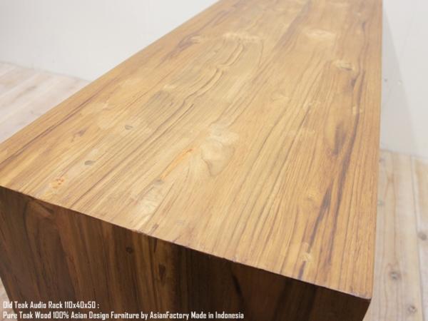 | チーク、マホガニー、ウォルナットは世界の三大銘木と言われ、非常に磨耗に強い高級木材として有名です。 チーク材の中でもオールドチークは古い家屋を解体した木材などを利用した材料で、充分に乾燥し、若い木材より堅牢で独特の風合いがあります。 そのオールドチーク材を贅沢に使用したオーディオラック110cmモデルです。 徹底して無駄を省いたのシンプルデザインでどんなお部屋にも合わせやすいです。 センターテーブル、コーヒーテーブルとしてはもちろんテレビ台としても使用できます。 色はブラシ加工で木目を浮立たせたナチュラルラスティックです。 ■サイズ:幅110cm×奥行40cm×高さ50cm ■オープンスペースのサイズ:幅102cm×奥行40cm×高さ19~20cm ■床と棚板間のサイズ:幅102cm×奥行40cm×高さ24~25cm ※インドネシアの職人によるハンドメイドですので多少の誤差はご容赦ください。 ■カラー:ナチュラルラスティック ■素材:オールドチーク材(総無垢材) ■原産地:インドネシア | ||
