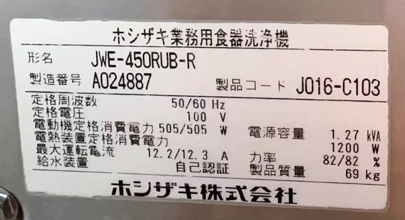 | 【中古】食器洗浄機 ホシザキ JWE-450RUB-R 2021年 100V | |