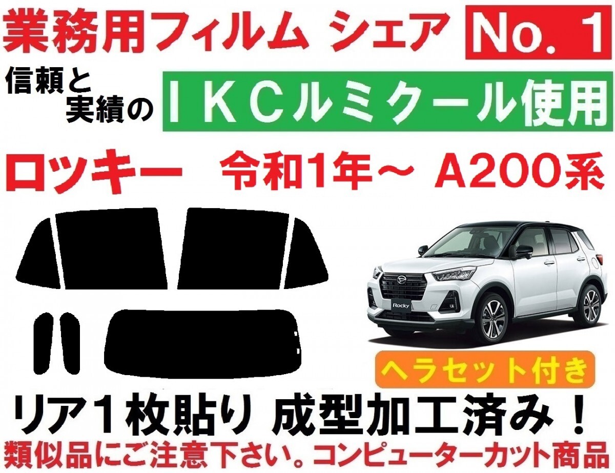 ロッキー A200系用『IKCルミクール使用』カット成型加工済みフィルム、リア5面セットです。(専用施工液付属) ・信頼の品質と実績で永い間業務用フィルムとして選ばれ続けているIKC製品です。 ・業務用フィルムの中で最も信頼性の高い、ベストセラー商品です。 ・詳しくはアイケーシー株式会社HPをご覧ください。 令和1年11月~ A200S A201S A202S A210S ロッキー に適合します。 ※適合などご不明な点は、お気軽にご質問下さい。 ◇◆◇当商品には、画像2のヘラセットが付属します◇◆◇ ■滑りの良いシリコンタイプのゴムヘラ スムーズに水切り(清掃)・貼り付け後の水抜きが出来ます。 実際の業務でも色々な物を試しましたが、シンプルなこの形状・このメーカー・このグレードの物が1番使いやすいです。 柔軟性が有りガラス(フィルム)に密着するため、フィルム折れも防げます。 ■使いやすい厚みとコシの有るプラヘラ 形状は似ていても各メーカーにより硬さ・厚みなど色々と有ります。 慣れていない方でも扱い易いように少々柔らか目の物になります。 ヘラ先にはフッ素樹脂加工のクロスを貼って有りますので、滑りが良くキズを防止します。 ■ワイプオール(不織布ワイパー) 布同様の丈夫さと紙の持つ吸水性を発揮。糸くずの発生が無く均一素材のため異物混入の心配が有りません。 施工前のガラスクリーニング~施工時にフィルムが触れる可能性の有るガラスの周りのゴム部品の拭き取り清掃~吸水等に大変便利です。 全て実際の業務に使用している物で、その中から使いやすい物を選んでいます。 ヘラセットがご不用の場合、フィルムのみの商品も有ります。こちら ◇◆◇精密コンピューターカット◇◆◇ 貼りやすさを最優先に各部のサイズ・形状など微調整し、改良を重ねた独自のデータを製作。 高精度な最新・大型カッティングプロッターによるカットで正確で滑らかなカットラインを再現しています。 施工業者だからわかる、貼りやすいサイズ・形状に仕上げています。 ◇◆◇1枚貼り成型加工済み◇◆◇ リアガラスの湾曲に合わせて熱成型加工して有りますので、平面に貼るのと同様にたるみが出ず1枚貼り出来ます。 通常の成型加工に加え、独自の加工を施し しっかりと成型加工してありますので、追加工など一切不要です。 ◇◆◇専用施工液付属◇◆◇ 軽視されがちな施工液ですが、貼りやすさに大きく関わる部分になります。中性洗剤などで代用せず、必ず付属の専用施工液をご使用下さい。 濃度については車種・季節などにより変わりますので、個別にお知らせ致します。 国内シェアNO.1の『IKCルミクール』を使用しています。 IKCルミクールは経年退色が極めて少ない着色加工技術はもちろん、安定した冷暖房効率をアップする熱線遮断効果や断熱効果、内装を守り日焼けを防ぐため、全てのフィルムで99%の紫外線カットを実現しています。 ガラスの飛散防止効果で高い安全性を保ち、ハードコートタイプなのでキズにも強いカーフィルムです。 信頼の品質と性能で、永い間業務用フィルムとして選ばれ続けています。 ■フィルムの種類■ 可視光線透過率 3% NS-003HC 可視光線透過率 7% NS-008HC 可視光線透過率13% NS-015HC 可視光線透過率20% NS-020HC 可視光線透過率30% NS-030HC 可視光線透過率46% NS-045HC ■全商品、キズに強いハードコート・紫外線(UV)99%カットです。 ※可視光線透過率が低くなるほどフィルムの色は濃くなります。 サイドとリアで濃さを替えたり等、可能です。 部分的にフィルムが必要になった場合、単品販売も承ります。 他にもロッキー用フィルム、各種出品中です。こちらもご覧ください。 下記の車両にも適合します。 ・トヨタ ライズ(A200A・A210A) ご不明な点など有りましたら、お気軽にご質問下さい。 | ||