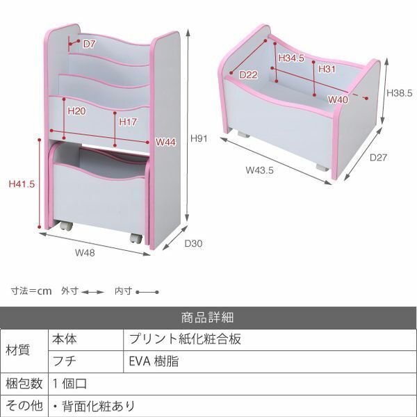 【カラー】 ホワイト×ブラウン ホワイト×ピンク 【サイズ】 <外寸> 本体:幅48×奥行30×高さ91cm おもちゃBOX:幅43.5×奥行27×高さ38.5cm <内寸> 各絵本棚:幅44×奥行7×高さ17~20cm おもちゃBOX:幅40×奥行22×高さ31~34.5(有効41.5)cm 【耐荷重】 絵本棚:各(約)5kg以下 ラック:(約)15kg以下 【材質】 本体:プリント紙化粧合板 フチ:EVA樹脂 【生産国】 中国 【梱包】 サイズ:106.5×33.6×14cm、重量:18.3kg 【その他】 ・背面化粧有り ・ラックにキャスター4個 【組み立て品】 お客様による組み立てが必要です。 |