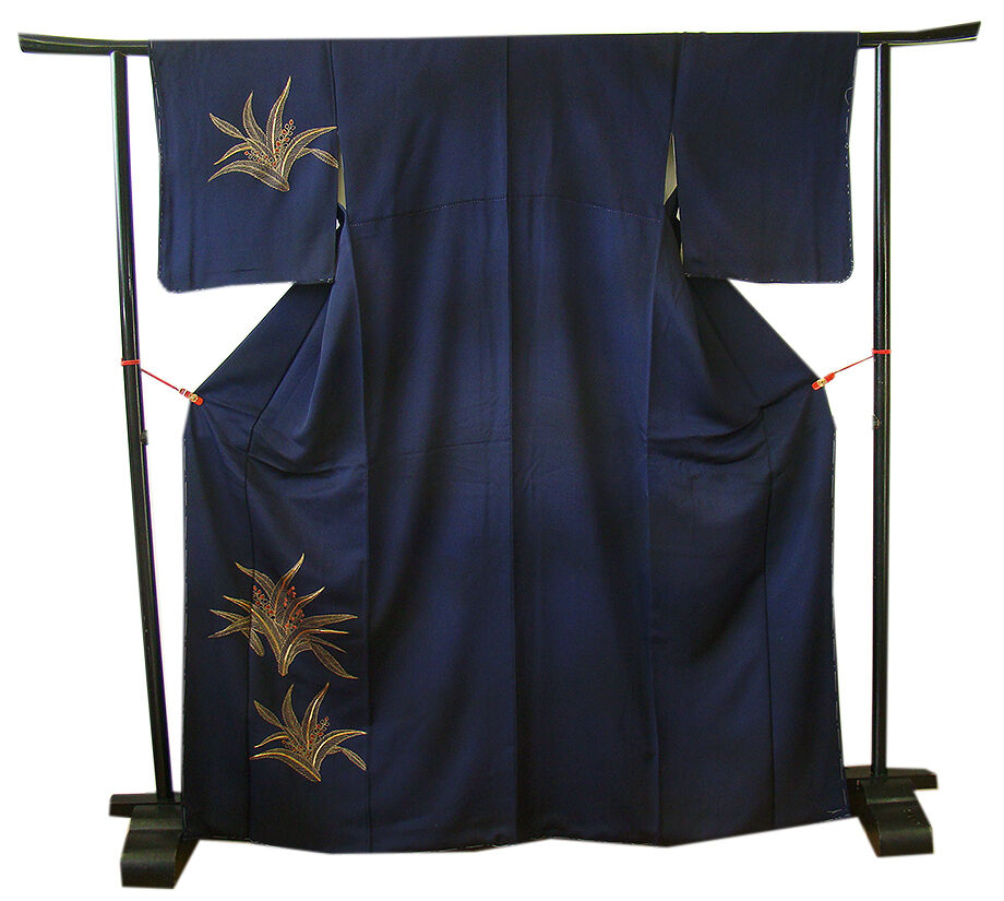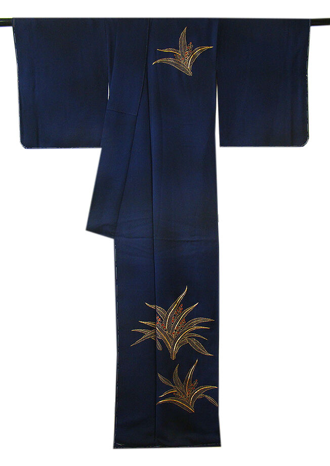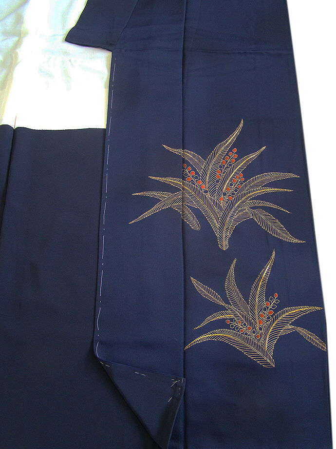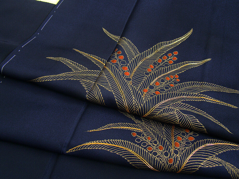 | 商品説明 | こちらのお品は「袷」ですので10月から5月までお召頂ければと思います。 とてもしなやかで柔らかな手触りの着心地良い重めの上質な極上一越地の生地、 渋い濃紺色地に草木柄の金彩加工染に刺繍入り、 八掛は褐色(正絹)、幅広い年代の方にお召頂けます。 |