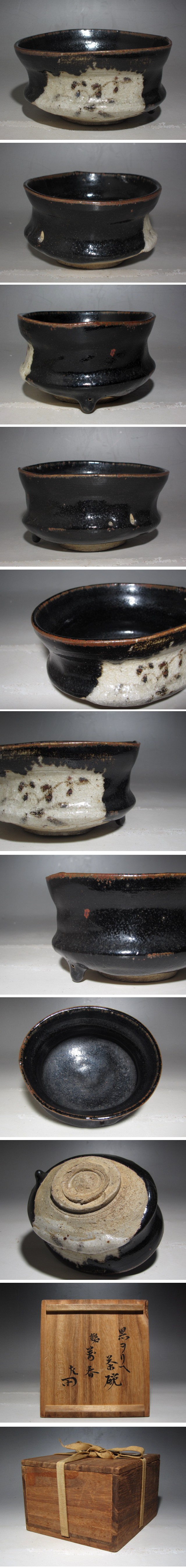 古黒織部茶碗「萬春」です。 箱蓋裏に表千家十二代惺斎の花押があります。 時代を感じる素晴らしい逸品です。 サイズ 直径13.5cm/高さ7cm(多少の誤差はお許しください) 状態 一見して疵やヒビ・直しは見られません。 骨董品という事をご勘案頂き、時代経過のスレや、小さな傷がある場合があるかもしれませんのでご承知置きください。 | |||