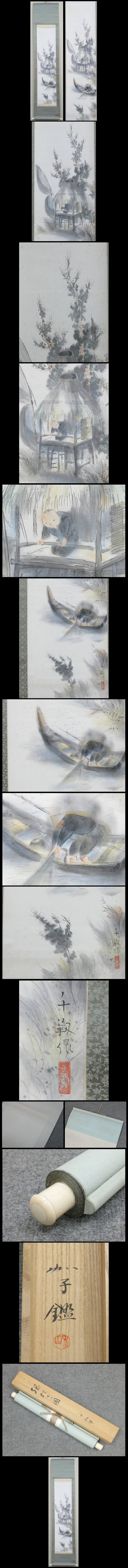 【郷倉千靭】 1892年3月3日生~1975年10月25日没 1892年 富山県射水郡小杉町(現・射水市)に呉服商の次男として生まれる 1904年 富山県立工芸学校漆工科を卒業、竹内の工芸と絵画の素地を培う 1915年 東京美術学校日本画科を卒業、本名與作で寺崎広業に師事 1916年 アメリカへ留学(ボストン美術館所蔵品などの模写、ニューヨークで作品発表) 1921年 帝展(第2回)「雑草の丘」で初入選(後援者出品による) 1922年 院展(第8回日本美術院展)「地上の春」で初入選、同年院展賞受賞 1924年 日本美術院同人に推挙される 1934年 帝国美術学校日本画科教授に就任 1936年 多摩美術学校(現・多摩美術大学)教授に就任、長く教壇に立つ 195260年代 院展中心に出品、「山霧」で日本芸術院賞受賞、以降評議員・会員になる 1971年 勲四等旭日小綬章を受章 1972年 日本芸術院会員に就任(没後は追贈勲三等瑞宝章) 1975年 世田谷区の病院で急性心不全により逝去、享年83歳 ★商品サイズ★ ■掛軸 204×45cm ■作品 133×33cm ★商品の状態★ 作品に時代のしみ汚れがあります。 裏側に薄じみがあります。 ご承知のうえご入札をお願いします。 時代など詳しくは画像にてよく確認のうえでご検討いただければと思います。 どうぞよろしくお願いいたします。 ★真作と明記しております作品については、 万が一真作でない場合は、落札金額・送料をご返納致します。 また鑑定するにあたって、公的機関での鑑定料・交通費・その他の経費は ご落札者様ご自身のご負担になります。 鑑定についての保証期間は30日とさせて頂きます。 |