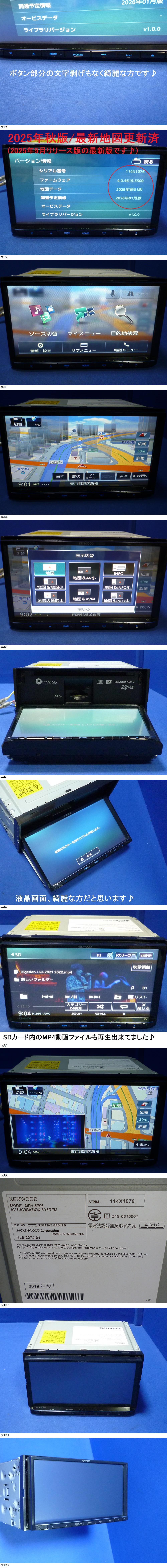 | 商品紹介 | ★★★地図データ最新版に更新済★★★ 地図データ 最新版・2025年秋9月リリース版(2025年01版) ファームウェア 最新版(4.0.4619.5500) 開通予定情報 最新版(2026年第01月版) メモリーナビ SDナビ KENWOOD ケンウッド MDV-S706 シリアルNO.114X1076 2019年製 外形寸法(W) x (H) x (D)180mm x 100mm x 183mm 埋込寸法(W) x (H) x (D)178mm x 100mm x 160mm 【主な特徴】 ハイレゾ音源「FLAC、WAV(192kHz/24bit)」など、さまざまな音楽ファイルフォーマットに対応 クリアな地上デジタル放送が楽しめる“広感度地デジチューナー”を搭載 フロント/リア用ナビ連携型ドライブレコーダーに対応し、フロント/リアの同時録画が可能 本機とナビ連携型ドライブレコーダーの「DRV-N530」(フロント用)と「DRV-R530」(リア用)を 組み合わせることで、フロント/リアの同時録画が可能です。 万が一の時の録画はもちろん、ドライブ中の後方安全確認などを、 本機のモニター上で見ることができます。 <高画質と高速レスポンスを実現する彩速テクノロジー> 彩り鮮やかでメリハリのある高画質を楽しめる「光沢パネル」を採用 「ジェットレスポンスエンジンⅢ」の搭載により、高速レスポンスを実現 当社独自の高速描画技術「ジェットレスポンスエンジンⅢ」を搭載。 フリック、ドラッグなどスマートフォン感覚のタッチ操作にもすばやく反応します。 その心臓部には、デュアルコアCPUを搭載。 複数のプロセスを同時並行で処理できるため、ナビゲーションしながら動画再生といった 高い負荷のかかる処理もストレスなく行えます。 膨大な情報量を格納しながら、高速レスポンスを実現するデータ圧縮技術 「S3フォーマット」を採用 地図データなどを検索・表示する際に高速レスポンスを実現する CDを最大約4倍速でSDカードに録音可能 ケンウッド製専用リアビューカメラの接続に対応 マルチリアビューカメラ「CMOS-C320」、 スタンダードリアビューカメラ「CMOS-C230/C230W」との接続に対応。 クリアな画像で後方の安全確認をサポートします。 取り外すまで問題なく使用出来ていた物になります。 出品に辺り、卓上電源にて下記動作確認・写真撮影しております。 写真2枚目~6枚目と下記写真はお届けするナビの現物写真です。 ボタン部分の文字剥げもなく綺麗な方だと思います♪ 液晶画面、多少の汚れがある位で 目立つ傷等なく綺麗な方だと思います♪ タッチパネルズレありません♪ ・ナビ基本操作:OK ・地デジフルセグ&ワンセグTV視聴:OK ・USB、音楽ファイル再生:OK ・iPhoneケーブルでUSB接続、iphone音楽ファイル再生:OK ・SDカード、音楽ファイル再生:OK ・DVD再生:OK ・CD再生:OK ・GPS受信:OK ・スピーカーからの音出し:OK ・Bluetooth接続、スマホ内音楽再生確認:OK ・マイク接続、ハンズフリー通話確認:OK ・ラジオ受信:OK ・パネル開閉/角度調整:OK ・ユーザー設定の初期化:済み お届けは下記になります。 カーナビ本体、 電源配線(走行中にDVD、TVが見れるような配線加工されてました)、 GPSアンテナ、 フルセグ地デジアンテナコード×4、 新品フィルムアンテナ(両面テープ)×4、 マイク、 USBコード(本体直付け)×2本、 になります。 B-CASカードレスタイプです。 問題なくフルセグ受信、視聴出来ております♪ 本体背面に・・・ ケンウッド製リアビューカメラ「CMOS-C230/C230W」入力や、 車両アンテナからの入力、 リアモニターへの映像出力、 ドライブレコーダー(DRV-N530等)からの映像入力、等が有ります♪ 汎用バックカメラを接続する場合は、 汎用RCA変換ケーブル(CA-C100)が必要です。 上記の付属品に含まれてない場合は必要に応じてご用意下さい。 ナビ製品詳細ページ ←クリックしてご覧頂けます ナビプレスリリース ←クリックしてご覧頂けます 取扱説明書 ←クリックしてご覧頂けます 取付説明書 ←クリックしてご覧頂けます 比較的綺麗な方だと思いますが、 こちらは中古品になりますので、年相応の使用感や小傷、汚れ等ございます。 出品に辺り写真に写っている動作確認は確認出来ておりますが 短時間での確認となり、その他全ての動作確認を出来ている訳ではございません。 保証は有りませんので、その点ご了承の上、ご入札願います。 また電源配線など、途中でカットしている場合もございますし、 加工している場合もございます。 必要に応じて、取付の際、加工が必要な事もございます。 配線コード関係はビニールテープ等の粘着が残っている場合もございます。 ツメ等もカケが有るかもしれません。 いずれも動作には支障ありませんし、取付業者は手慣れている事だと思います。 配線、コード関係はあくまでおまけとお考え頂き ご理解の上、ご入札願います。 取付方法、ご使用方法によって破損、故障する場合も有りますし、 同商品の一部差し替えによる返品防止の為、 ご返品、ご返金は一切出来かねます。何卒ご理解願います。 万一、運送トラブル等で破損の際は、運送保険にてご対応願います。 ------------------------------------------------- 送料一律1500円 (北海道、沖縄は