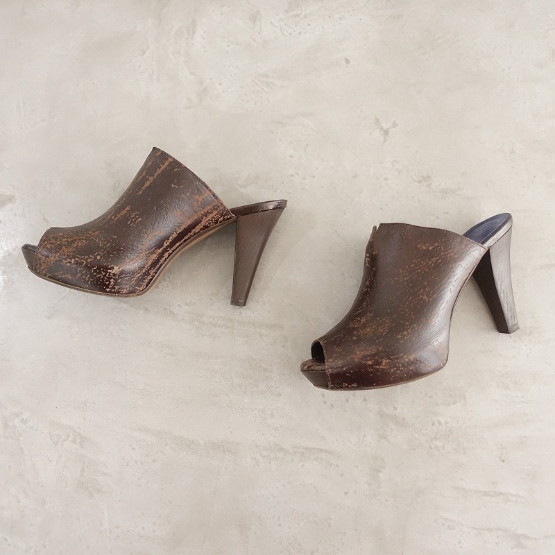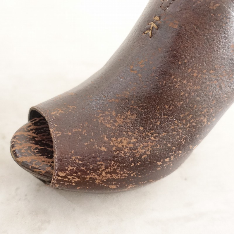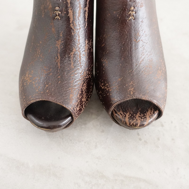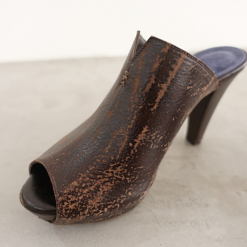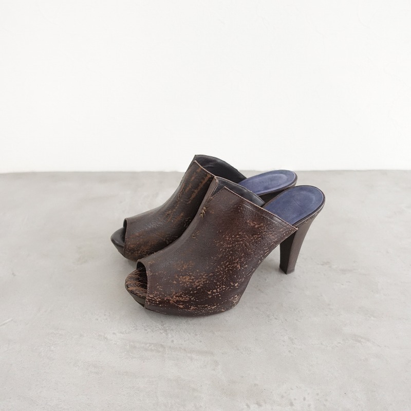| HENRY BEGUELINのオープントゥヒールパンプスです。カラーはダークブラウンで、アッパーにヴィンテージ加工が施されたレザー素材です。アッパーの甲部分にV字にカットされており、下にブランドロゴの刺繍があしらわれております。オープントゥタイプで、インソールはブルーのスエードです。 |