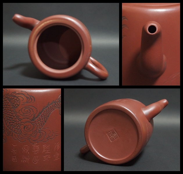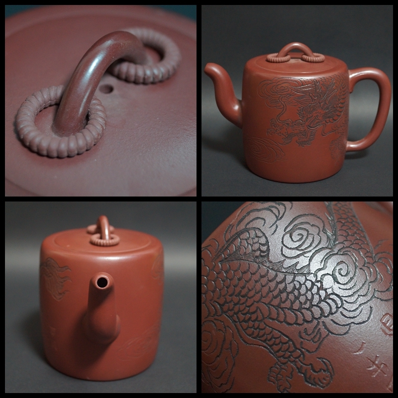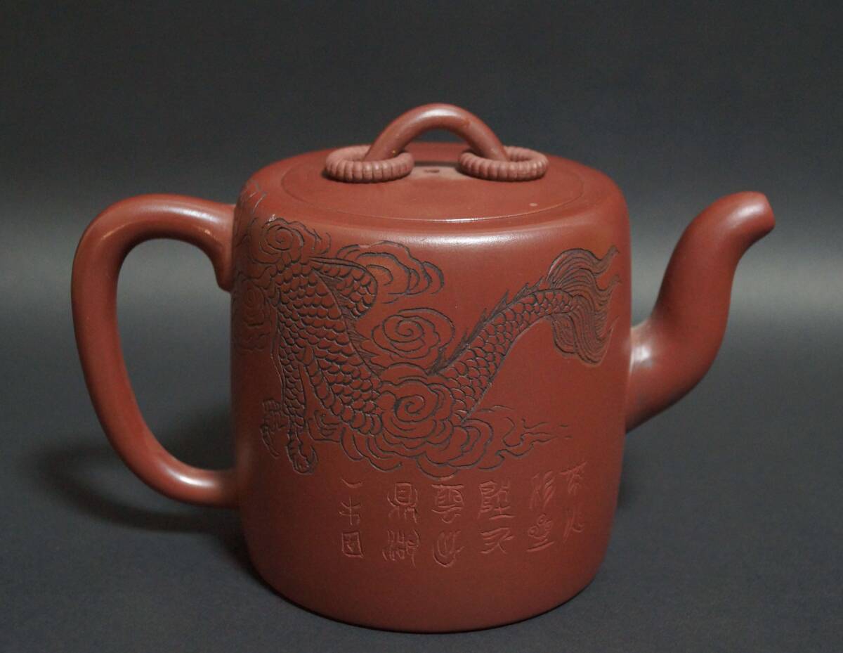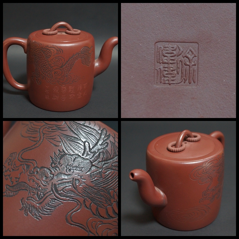 中国宜興紫砂陶芸家 徐偉偉造 紫砂細工急須 刻『雲龍漢詩文』造形紫砂壺 朱泥 遊環摘 煎茶道具★共箱★ サイズ(約): 長さ15.5㎝(注ぎ口〜取手まで)、幅8.5㎝、高さ10㎝、重さ389g |