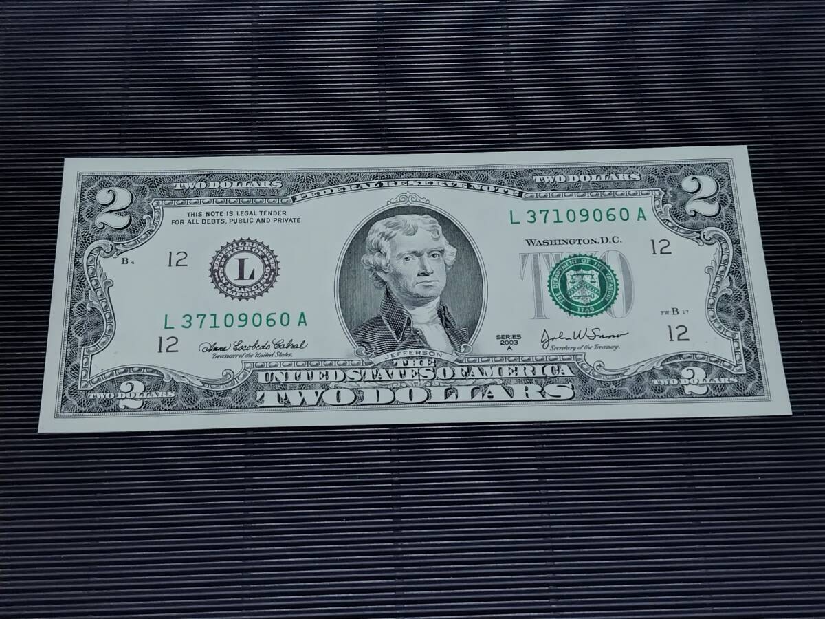 人気 金運上昇   即落 米国(アメリカ合衆国) サンフランシスコ連邦準備銀行(L) 2㌦札  コレクション向きのピン札  2003年 未使用 独立宣言 ジェファソン #L 37109075A