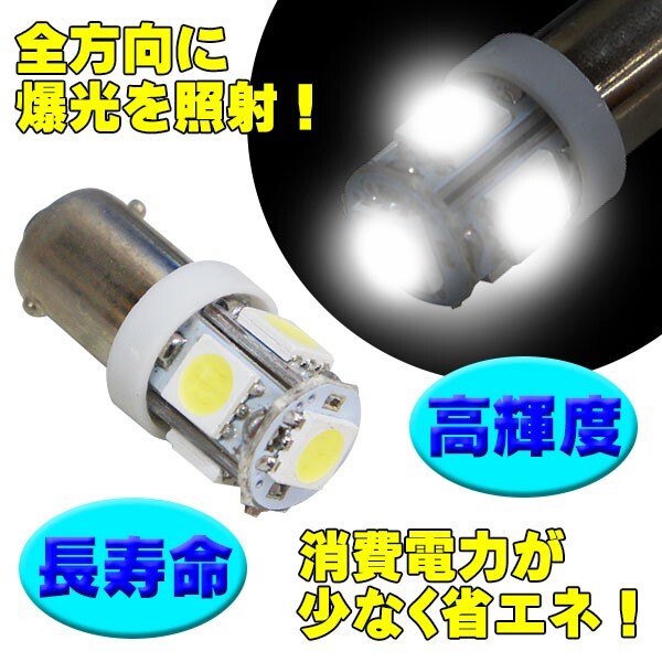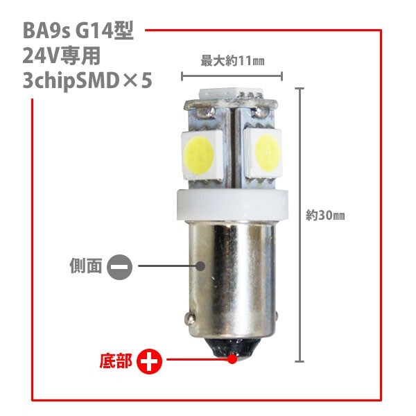 | 商品説明 | BA9S 5SMD LED 3チップSMD採用♪ 24V専用 角マーカー ルーム球などに 10個セット ※10個セットの価格になります。 当店をご来店頂き、誠にありがとうございます。 ★仕様 BA9S ★10個セット ★サイズ:長さ 約3.0cm 最大幅 約1.1cm ★発光色 ホワイト ★電圧 24V ★5連 LED 3チップ SMD ハイパワーLED 広角・超爆光♪ 省エネ長寿命なのにこの明るさ!!ホワイトの優しい色合いと明るさ、広拡散型なので強い光で明るく照らします。かなりの明るさなので直視厳禁!!! LED化についての注意事項 ご自身の車種のLED化についてよくお調べのうえ、御購入頂きますようお願い致します。 ●極性がありますので、点灯しないときは差込を逆にしてください。 ●ご使用のお車のソケットの形状等はご自身でお調べお願いいたします。 ●高温な場所ではLED寿命が著しく短くなる場合がございますのでご注意ください。 ●発熱いたしますので、取り付け場所にはご注意ください。 ●LEDは静電気・熱等に弱いためお取り扱いにはご注意ください。使用状況・使用頻度で寿命が変わりますことご了承ください。 ●車種別の適合等のご質問にはお答えしかねますことご了承ください。 ●車種によっては警告灯点灯などのアラームが出る場合がございます。(LEDの為消費電力が低いため球切れと判断される場合があります)必要であれば別途抵抗をいれるなど対応お願いいたします。 ●LEDは大変繊細な商品です、メール便での破損・損傷の保証はございません事ご了承下さい。 宅配便を選ばれることをお勧め致しますが、お客様自身でご検討宜しくお願い致します。 ●初期不良確認の為、取り付け前に必ず点灯点検をして下さい。 ※車種によってはLED交換により下記の現象が見られる場合がございま ○球切れが異常に早い。(他の電装品の影響による早期の球切れ) ○極性が有りますので、取り付けして点灯しない場合は、逆に取り付けして見て下さい。 また、ウェッジ球で接点不良により点灯しない場合がありますのでその際は、針金部を調整して見て下さい。 このような「車種の特性」によるトラブル現象については保障できません。