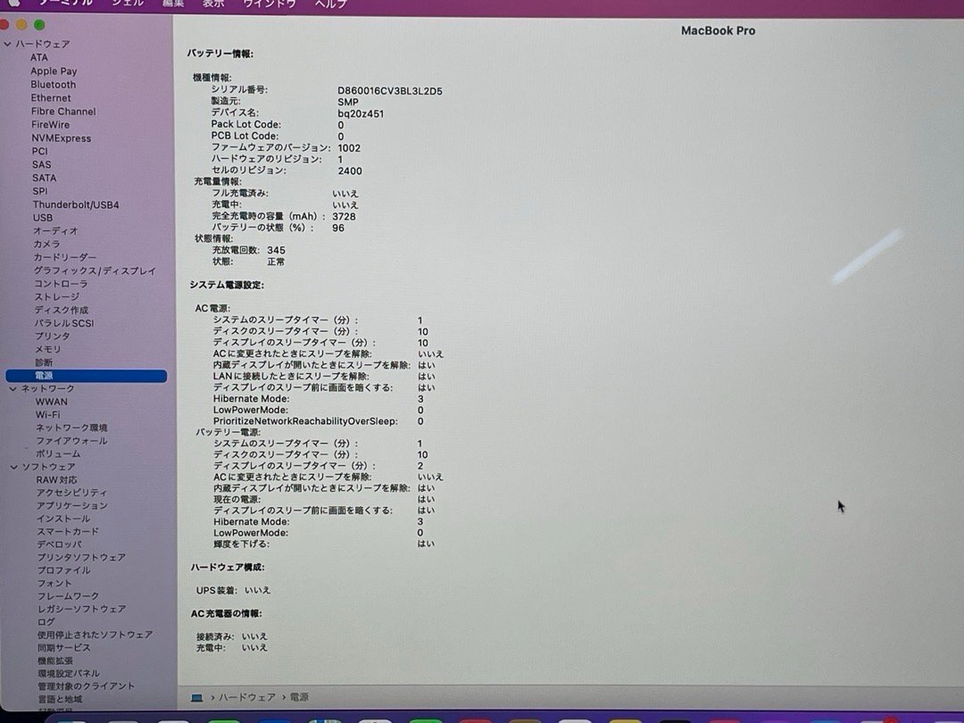 | バッテリー | あり(充電可) ※充電回数 345回 バッテリーの状態表示:正常 ※検品時点の状態であり、時間の経過とともに修理交換アラートに変わる場合もありますが保証対象外です。 ※同じバッテリの状態であっても、使用するOSのバージョンによって診断基準が異なり表示される結果が異なることを確認致しております。バッテリの状態を保証するものでは御座いませんのでご了承ください。 ※バッテリーは消耗部品の為、駆動時間は確認しておりません。動作保証対象外となります。 |