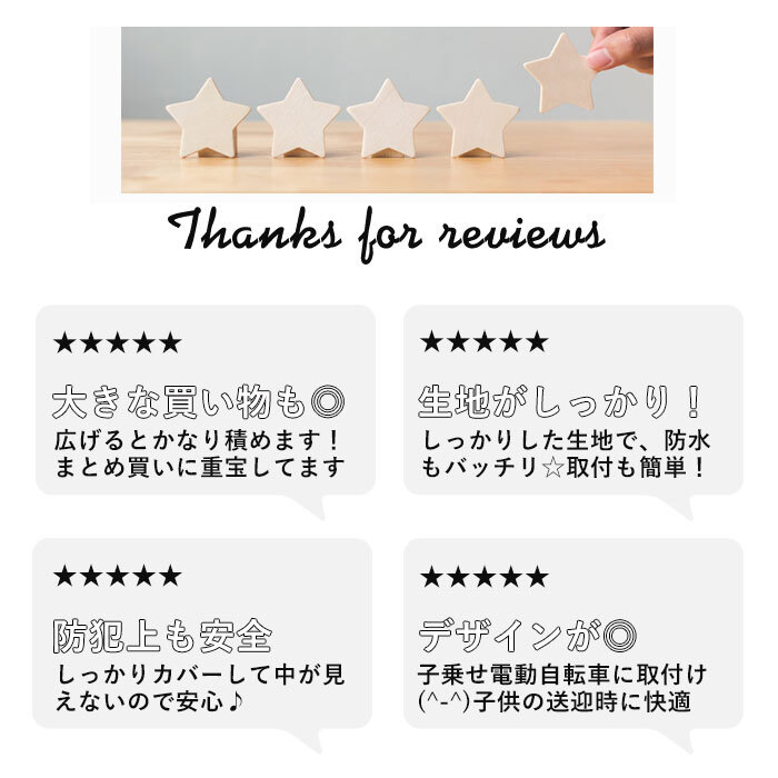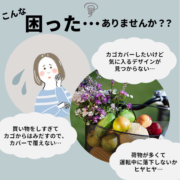 | 注意点 | ※※細かいメッシュカゴには使用できません。 ※汚れは水またはぬるま湯で洗い流してください。 ※もみ洗い等は避けてください。 ※洗剤のご使用はおやめください。 ※火気の近くでのご使用はおやめください。 ※鋭利なもので突いたりひっかいたりしないでください。 ※本製品は完全防水ではありません。 ※サイズより大きなカゴに無理矢理かぶせないでください。破れる可能性があります。 ※ひったくり防止や抑止には効果がありますが、安全ではありませんので、貴重品などの管理はご自身にて行ってください。 ※使用上の損失については補償できません。 ※用途以外にはご使用にならないでください。 ※自然光などにより、若干の変退色が起こる可能性があります。 ※デザイン、仕様等は予告なく変更、改良する場合がございます。 ※カメラやモニターの性質により、画像と実物の色の違いがある場合がございますのでご理解願います。 |
