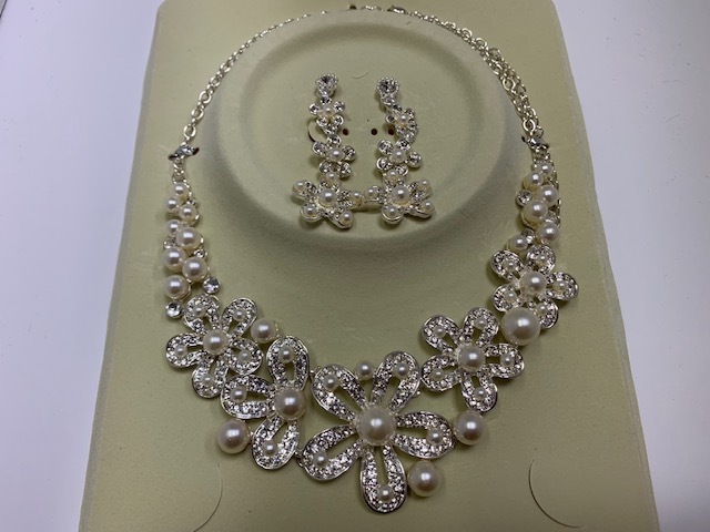 | ウエディングネックレス 大きめパールとラインストーンの輝きが ゴージャスな ネックレス華やかなお花+揺れる イヤリング | |||||