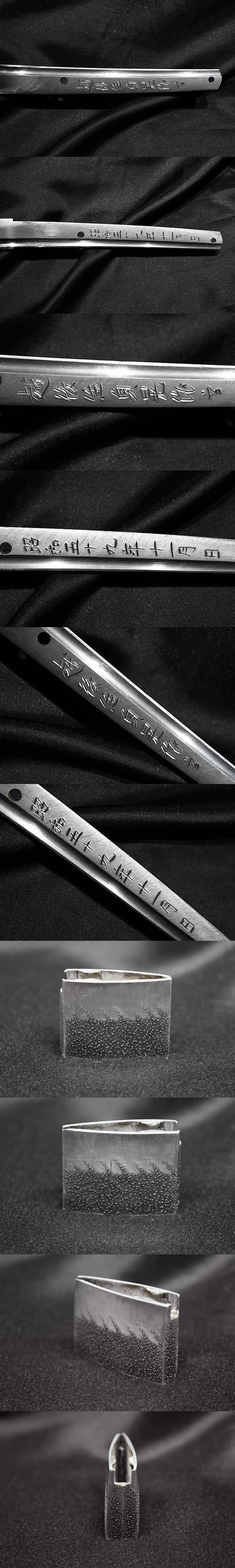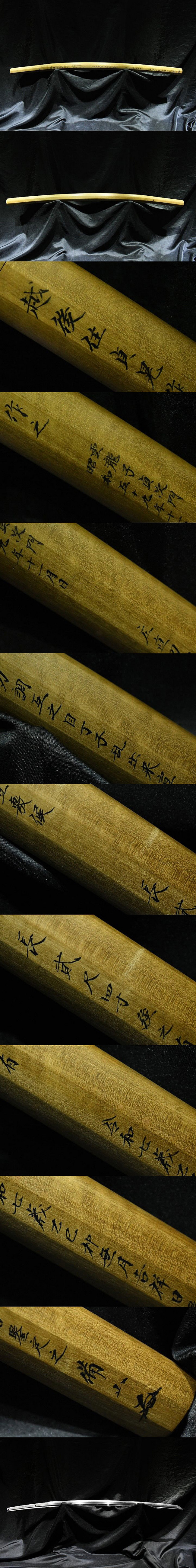 表【越後住貞晃作之】 裏【昭和五十九年十一月日】 種別:刀 サイズ:長さ 73cm 反り: 1.7cm 目くぎ穴 2個 元幅:約3.320cm 元重:約0.752cm 先幅:約2.361cm 先重:約0.545cm 刀身重量:約815.9g(ハバキ・柄をとった状態) ハバキ重量:約40g 鞘全長:約101.2cm |