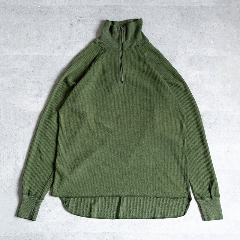 動きやすいようにラグランスリーブの仕様。サーマル生地のような凹凸のある生地が使用されています。ネック部分はハーフジップ仕様。上まで閉めれば首元をすっぽり覆う事が出来ます。