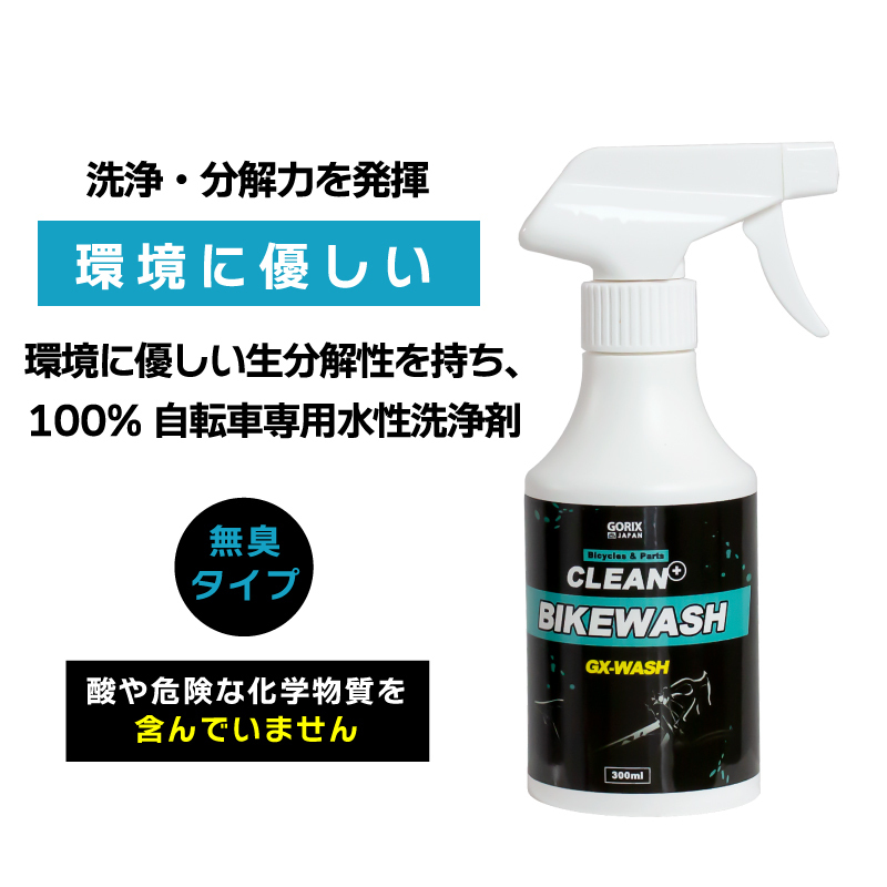 カーボンを含むフレームやパーツなどあらゆる場所に使える自転車用水性洗剤。 泥やほこりなどの表面の汚れを落とし綺麗に。 液体を直接噴きかけて5-10分放置し、濡れたスポンジで洗剤を拭き取って最後に水ですすぎます。 無臭タイプなので、香りが苦手でも安心に使用できます。 狭い空間でも気にせず使えます。 酸や危険な化学物質を含んでいません、欧州REACH規制の認可対象です。 ロードバイクやクロスバイク、mtb、電動自転車、ままちゃりまで日々のメンテナンスに。 環境に優しい生分解性を持ち、100%自転車専用水性洗浄剤。 商品内容GX-WASH バイクウォッシュ 容量300ml 成分LAS生分解性界面活性剤、EG、coconut extract 発泡剤等 機能あらゆる自転車の表面や部品の洗浄 毒劇区分普通物 容器仕様プラスチックスプレーボトル サイズ高さ約19cm (スプレー5.5cm含み), ボトル直径約φ7cm ON/OFFオンオフ切替式、ロック機能付 台湾製 《ご注意》 ・商品は入荷によりキズがある場合があります。 その場合は保証対象外になりますのでご了承お願い致します。 ・ディスプレイ環境により実物と色が異なる場合が有ります。 ・入荷時期により予告無く一部仕様変更する場合が有ります。 | |