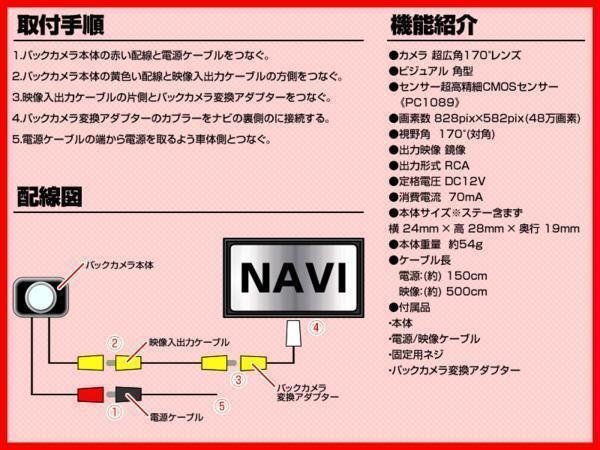 | ■視認性の高い広角タイプ 広角カメラなので視認性も高く、より確実な確認が出来ます。 また、バックカメラとして評価の高いCMOSセンサーを搭載しております。 ■専用の接続アダプター付き 映像ケーブルの接続は、専用の映像変換アダプタが付属しますので、無加工で接続可能です。 ※注意事項※ メーカー純正品ではございませんので、純正品をお求めの方は購入しないで下さい。 |