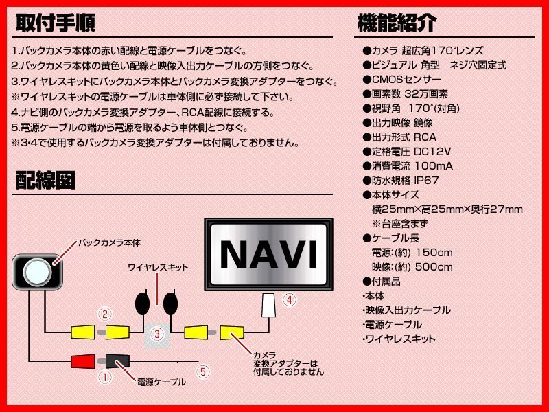 | ■CMOSセンサー搭載 バックカメラとして評価の高いCMOSセンサーを搭載しております。 また、広角カメラなので視認性も高く、より確実な確認が出来ます。 ■ワイヤレスキット付 映像信号を付属のワイヤレスキットで送受信させることが出来るため、煩わしい映像配線処理が比較的簡単に行なえます。 ■汎用性の高いRCA接続 映像ケーブルは、RCA映像ケーブルとなります。 ※バックカメラ用のRCA映像入力があるカーナビ・モニター等へ接続出来ます。 ■スマートなボルト固定取付タイプ 従来のタイプは、ステー部分が目立ってしまいますが、ボルト固定取付タイプは、出っ張りを最小限に抑えることが出来るため、スマートに取付が可能です。 ※注意事項※ メーカー純正品ではございませんので、純正品をお求めの方は購入しないで下さい。 |