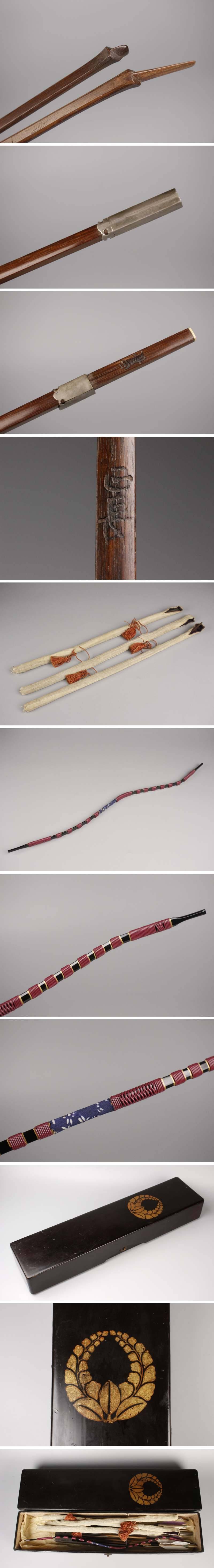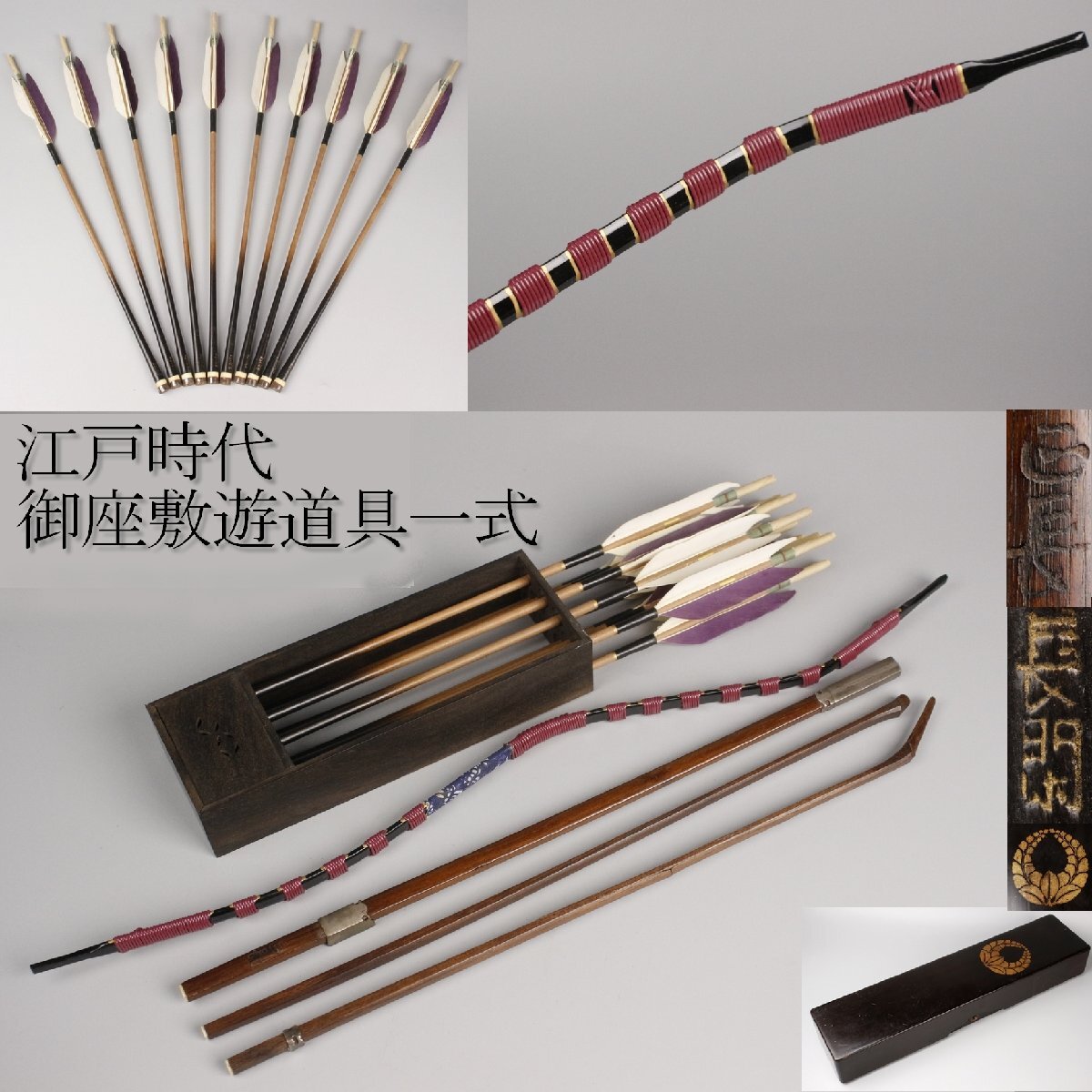 [.ET]25.11 25110509* * * 商品詳細 * * * ここでしか出逢うことのできない唯一の美をご紹介させて頂きます。 上質な造りで優雅な雰囲気を纏った座敷弓のご紹介です。 室内に小型の的を設置し離れた場所から座ったまま射て、当たりの数を競う遊びが 上流階級の間で広がり、江戸時代には庶民にも広まりました。 一つ一つ丁寧な造りで、箱には上り藤の家紋が入った箱に納められ 矢には「長閑」の銘が入り組み立て式の弓には「正長」銘が入っています。 細部に至るまで拘り抜かれた逸品を、 この機会に是非お手元にてご堪能ください。 ■商品内容/御座敷遊び道具一式 ※写真にあるものが全てです。 ■サイズ/矢:全長28㎝ 弓(ピンク):全長39cm 箱:横42.5cm×縦6cm×奥行10㎝ ■状態/経年による傷み、スレ、傷、割れ直し、羽に傷み、ちぎれ、 竹弓の間の繋ぎのパーツの欠損、 箱にスレ、傷、剥げ、欠け、漆ひび、割れがございます。 ※写真にてご確認、ご了承の上ご入札下さい。 ![]() ![]() * * * 支払詳細 * * * !かんたん決済 * * * 発送詳細 * * * 入金確認後3営業日以内に発送致します。 ※直接引き取りも可能です。 60~160サイズにつきましては 佐川急便、ゆうパックのどちらかで発送いたします。 ゆうパック発送の場合、弊社の発送日から追跡サービスに問合せ番号が反映されるまで 約1日ほどお時間がかかりますのでご了承下さい。 * * * 注意事項 * * * 運送中の破損があった場合は速やかに当社までご連絡下さい。 保険を利用するのに受取連絡後に運送会社による現場での破損状況確認が必要となります。 勝手に返送されますと保険の適用外となりますのでご注意ください。 * * * * * * お問い合わせ:082-236-8669 |