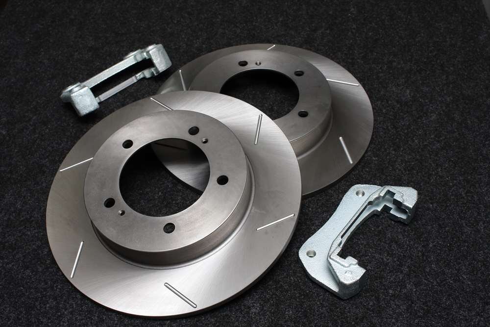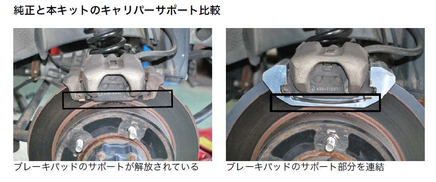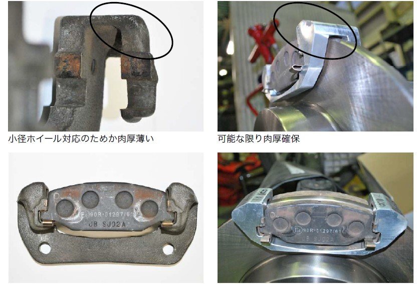 | 商品内容 | ■オフセット用キャリパーブラケットと専用大径ブレーキローターのセットです。純正ではストッピングパワー不足を感じてしまうジムニー用に開発しました。 1.純正ブレーキローター外径289mmに対して当社品は314mmとなり約1inch大径化できます。 2.JB23Wジムニーは純正のブレーキローターにハブ径107Φ車輛と108Φ車輛が存在します。当社では両車輛用にそれぞれ製品設定しています。※車輛適合の確認はパンフレットの2ページ目の適合リストをご確認ください。純正ホイール以外の場合は下記の確認用型紙にてクリアランスを現車確認してください。 3.特別な書類等を必要とせず車検が受けられる事 4.制動力の不満を解消する事 ・防錆対策としてパーカー処理をしています(2023年10月~) ビッグローターキット製作時に純正キャリパーを流用する場合、オフセット ステーのみを製作しブレーキキャリパーをキャリパーサポートごとオフセッ トするものが主流です。 本キットの場合、キャリパーサポートの移動量やアクスル・ハブ周辺のオフ セットステー設置の自由度の少なさ等からキャリパーサポートを製作しブ レーキパッドを装着、そこに元のキャリパーを装着する方式を採用しまし た。 純正のローター径289mmに対し約25mm(1インチ)大径化し314mmとしま した。純正同様ソリッドタイプになります。 構成部品 ・キャリパーサポート × 2 ・ディスクローター × 2 詳細は→【シルクロード】で検索して下さいして下さい。 ★★キャリパーブラケット:意匠登録済 [登録第1611324号]★★ブレーキ 防錆対策としてパーカー処理をしています(2023年10月~) |